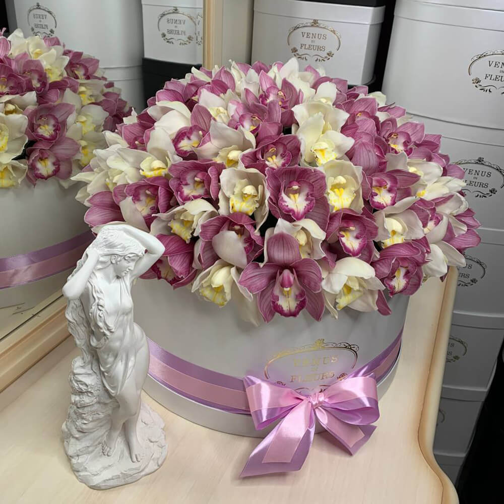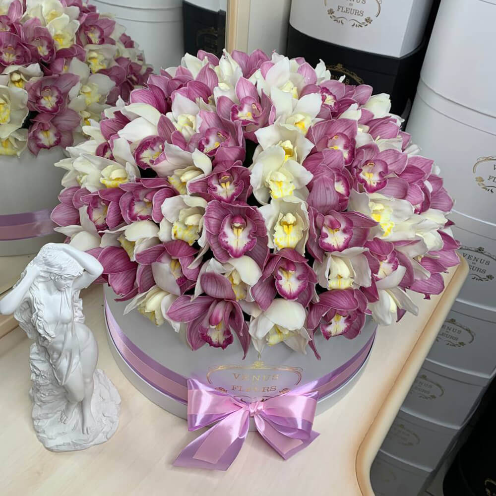 Орхидеи в шляпной коробке всегда останутся классикой и альтернативой букетам.