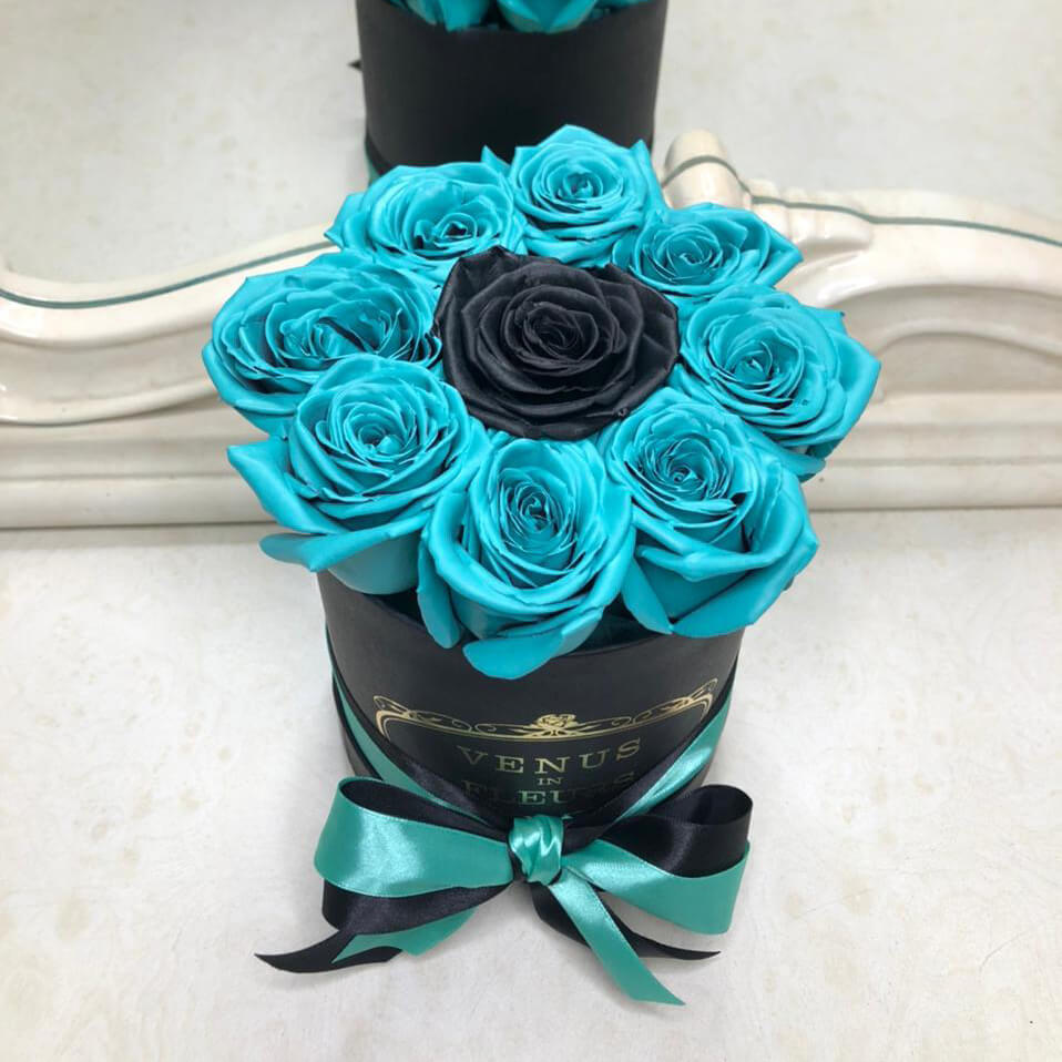 Роз такого цвета в природе не существует. Для их производства мы используем живые цветы и только высококачественную флористическую краску без запаха из Германии. Она гипоаллергенна, не пачкается и не осыпается. Ароматизируем розы легким цветочным парфюмом.