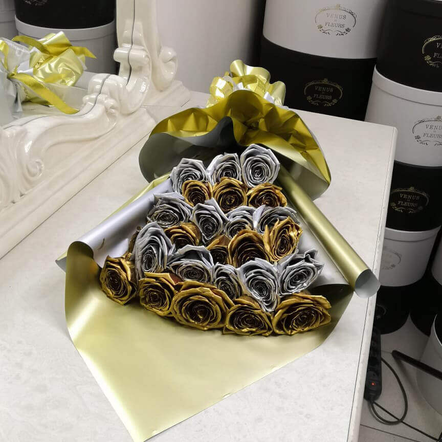 • фирменная транспортировочная коробка, упаковочная пленка, атласные ленты