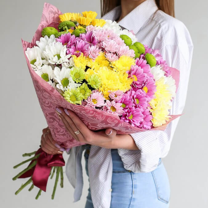 Большой букет из хризантем подарит только самые положительные эмоции: ведь он красивый, нежный, ароматный. Ваша вторая половинка будет в восторге, увидев такое чудо вживую.