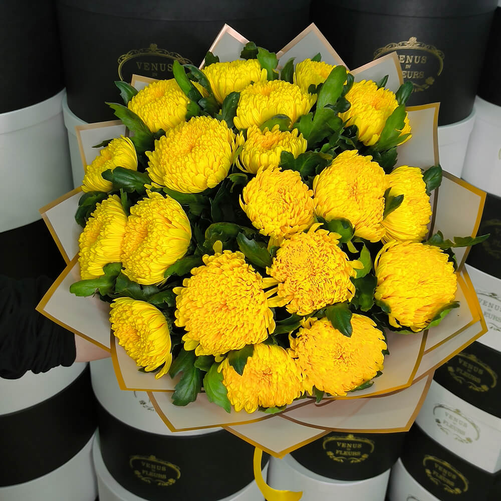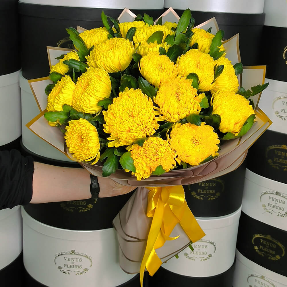 Нежный и ароматный букет хризантем будет прекрасным подарком вашей второй половинке, она будет в восторге, увидев такое чудо в живую.