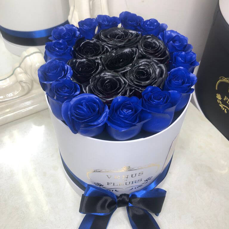 Роз такого цвета в природе не существует. Для их производства мы используем живые цветы и только высококачественную флористическую краску без запаха из Германии. Она гипоаллергенна, не пачкается и не осыпается. Ароматизируем розы легким цветочным парфюмом.