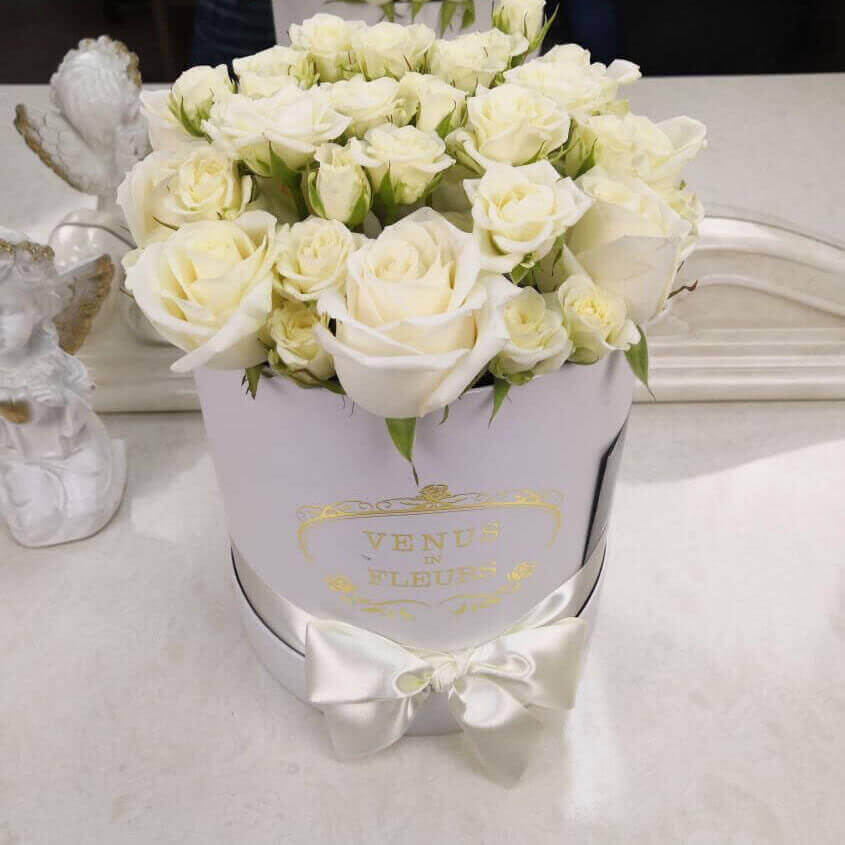 • белая коробка ручной работы, атласные ленты, флористическая губка