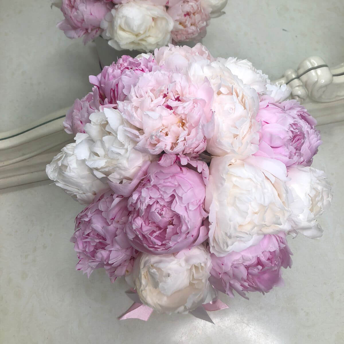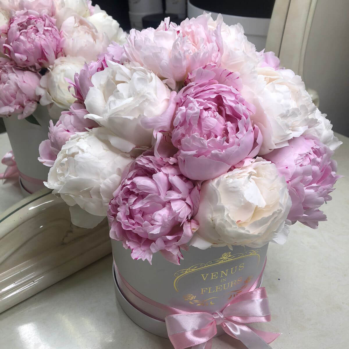 • белая коробка ручной работы, атласные ленты, флористическая губка