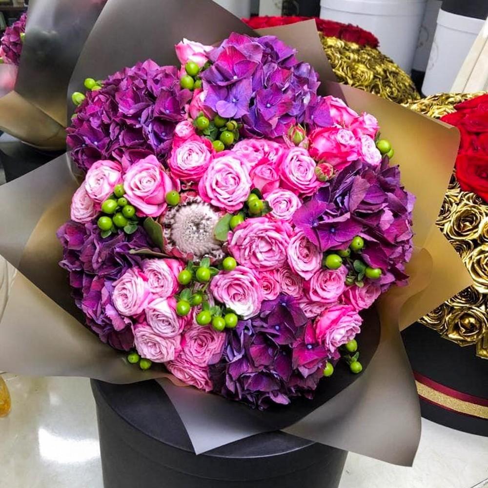 • 5 гортензий, 10 пионовидных роз, 9 гиперикум, 1 протея