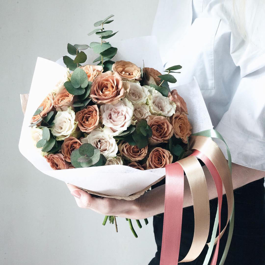 • 20 кофейных роз, 9 роз, эвкалипт