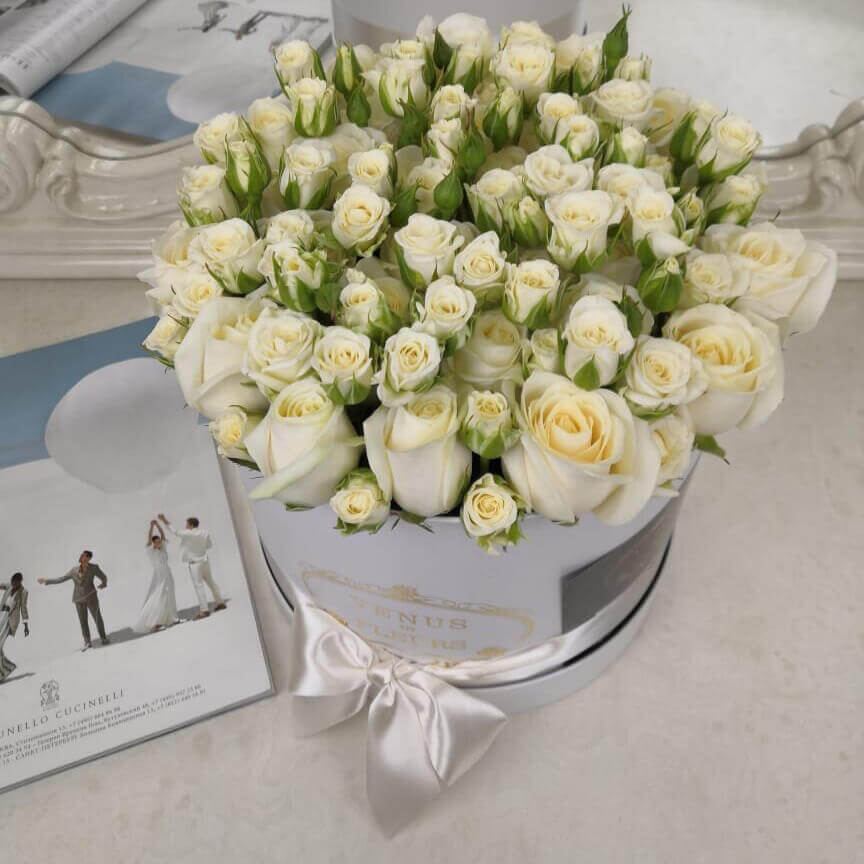 • белая коробка ручной работы, атласные ленты, флористическая губка
