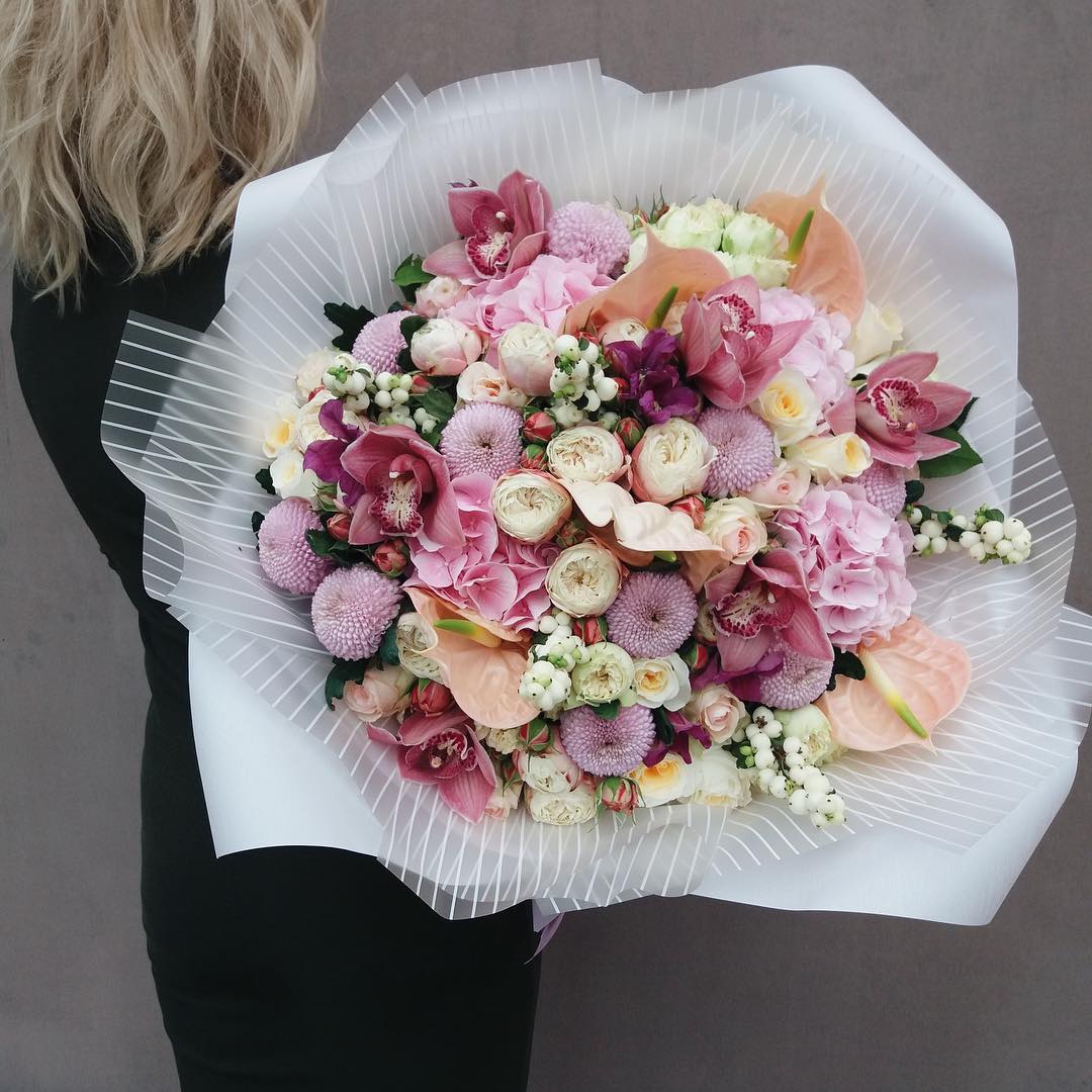• 2 гортензии, 10 кустовых пионовидных роз, 14 роз, 10 хризантем, 5 орхидей, 10 гиперикум