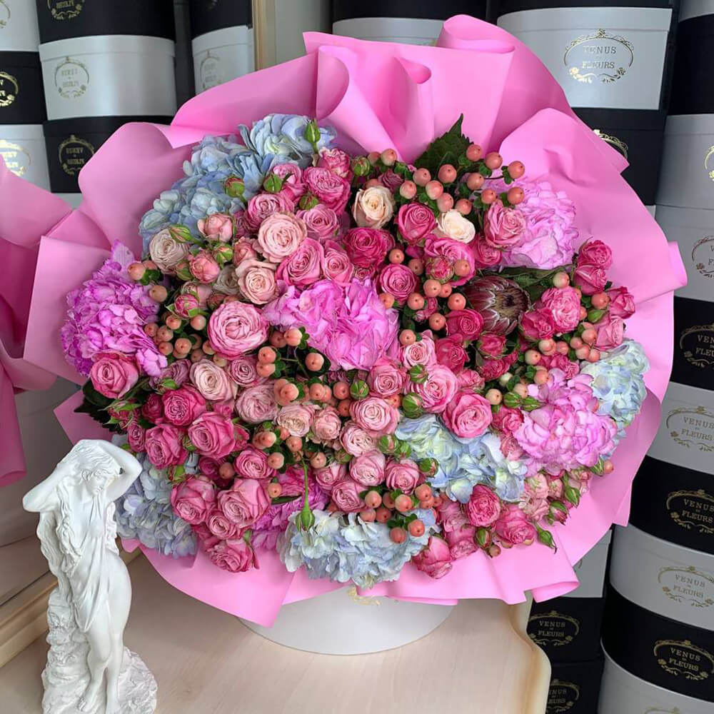 • 9 гортензий, 41 пионовидная роза, 20 гиперикум, протея