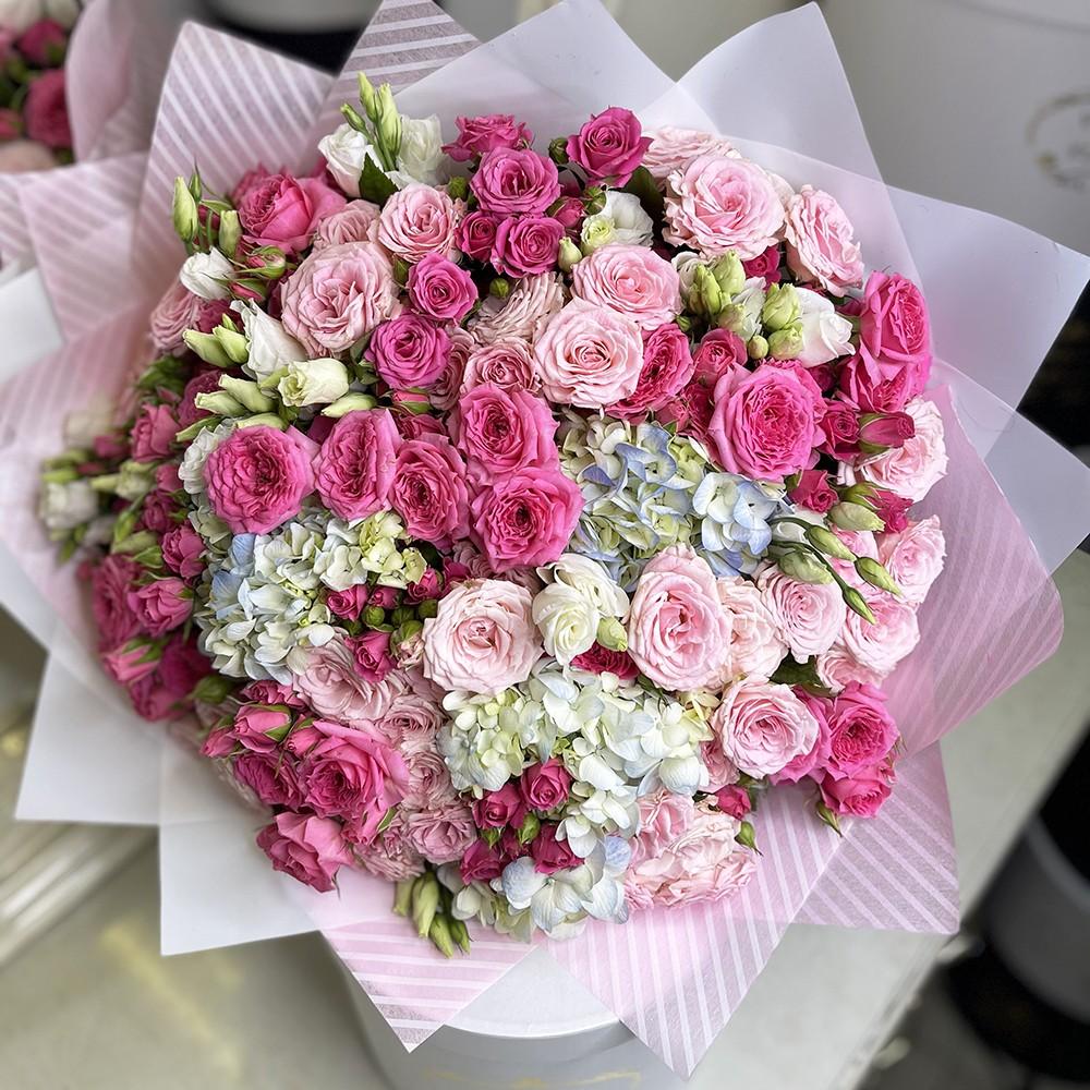 • 30 кустовых роз, 1 гортензия, 10 эустом