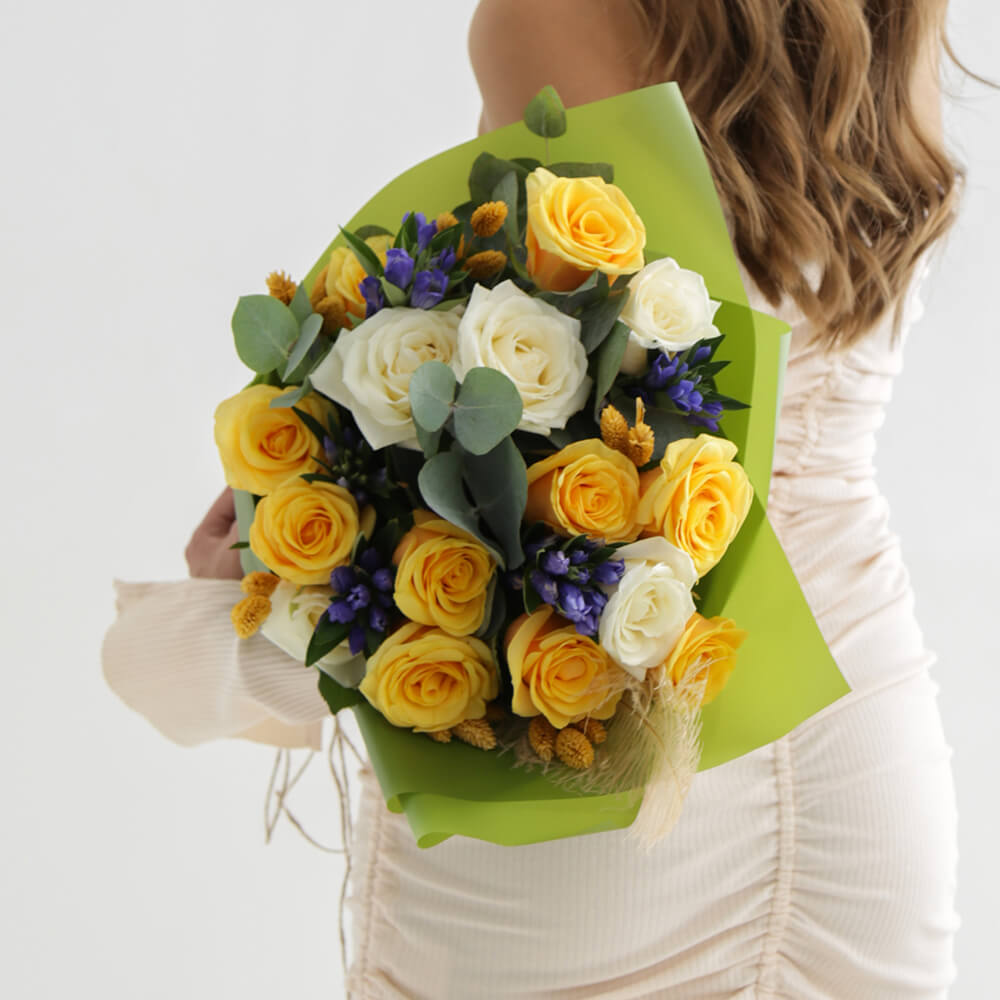 • Розы - 15 шт., гентиана - 8 шт., эвкалипт, сухоцветы