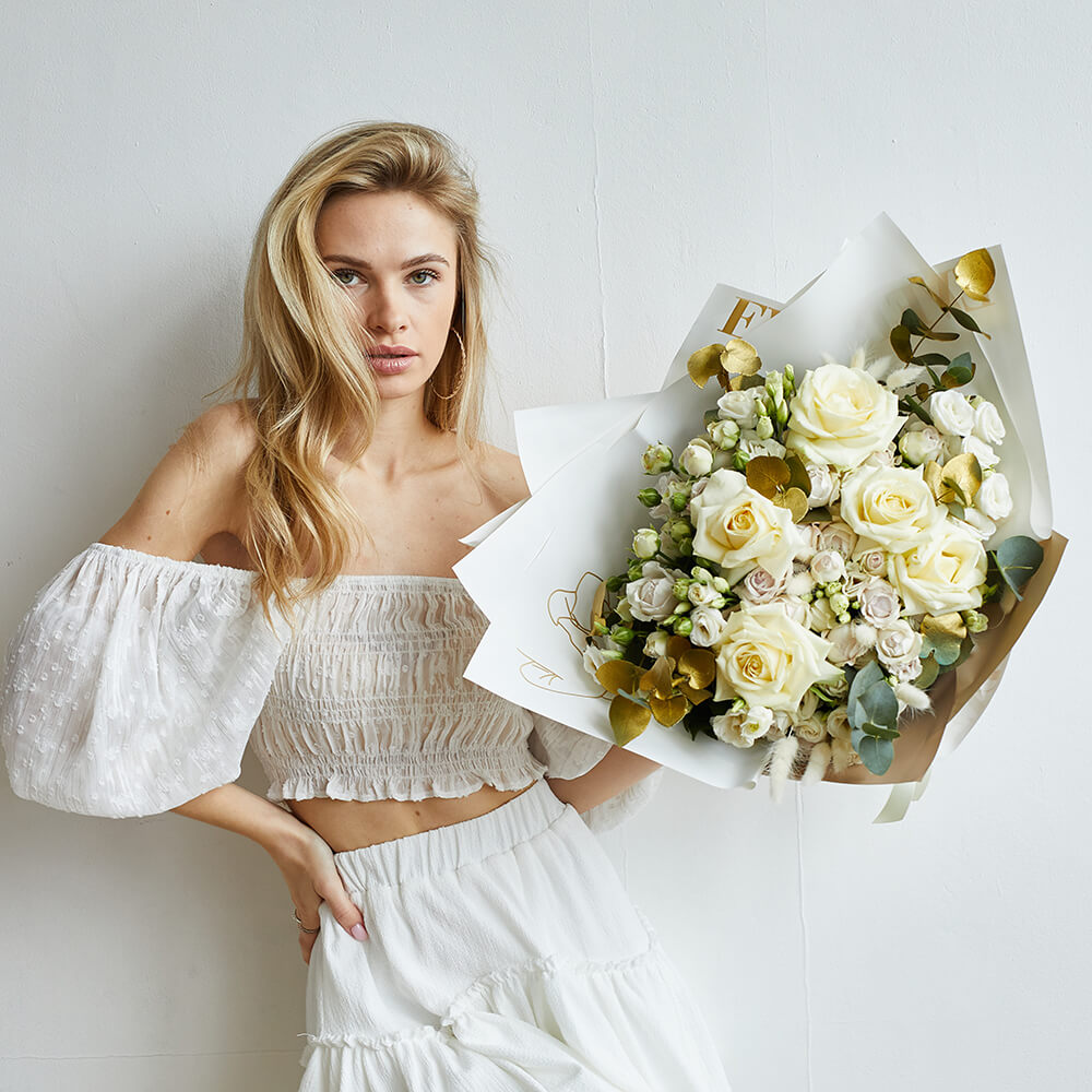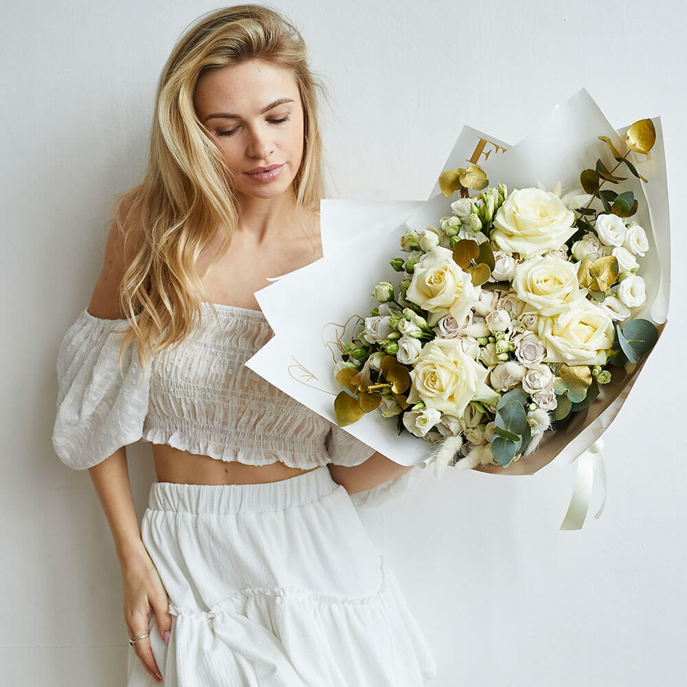 • 5 роз, 10 эустом, 6 кустовых пионовидных роз, лагурус, эвкалипт