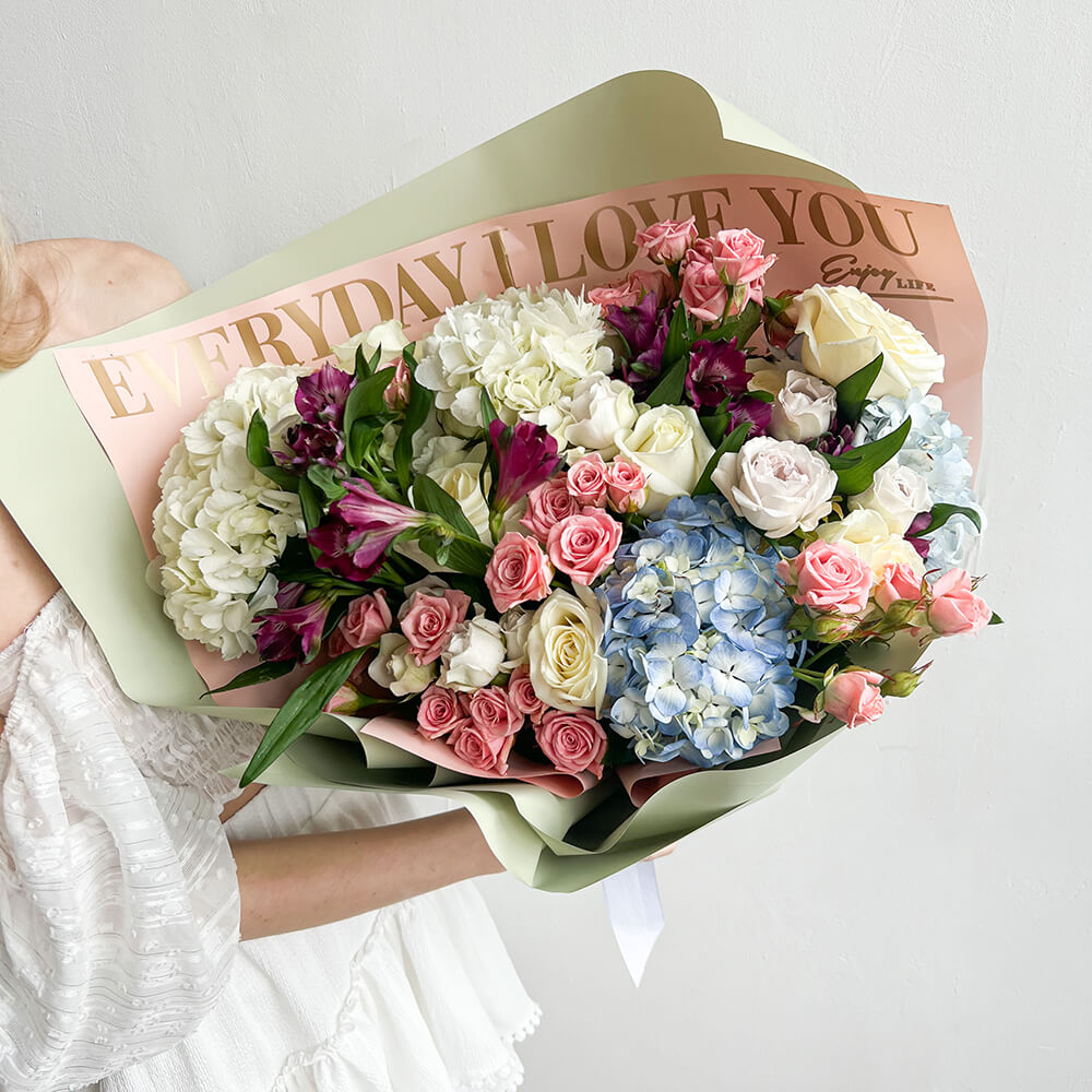 • 4 гортензии, 7 кустовых роз, 7 роз, 7 альстромерий, 6 кустовых пионовидных роз