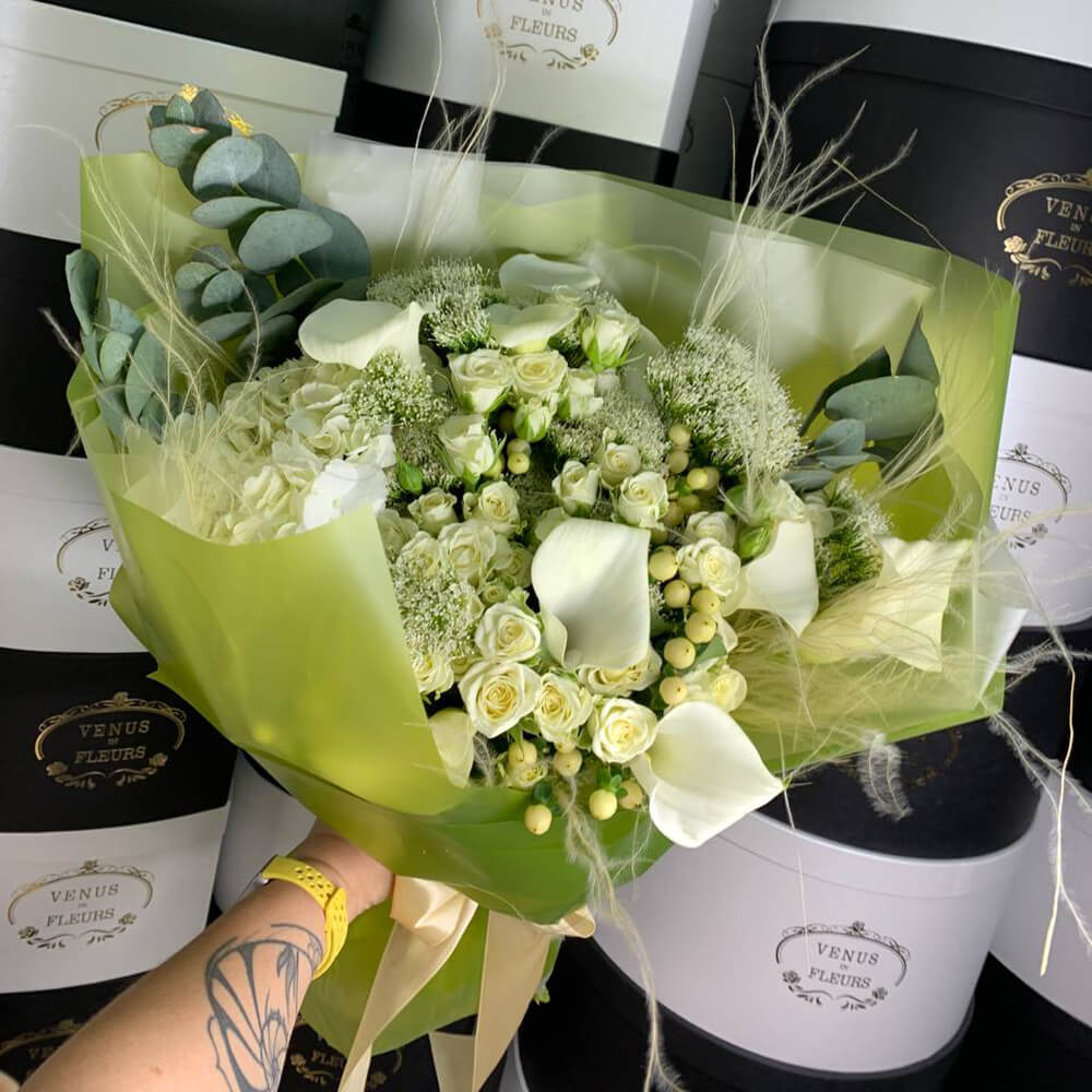 • 10 кустовых роз, 10 калл, 10 трахелиум, 10 гиперикум, 1 гортензия, сухоцветы, эвкалипт