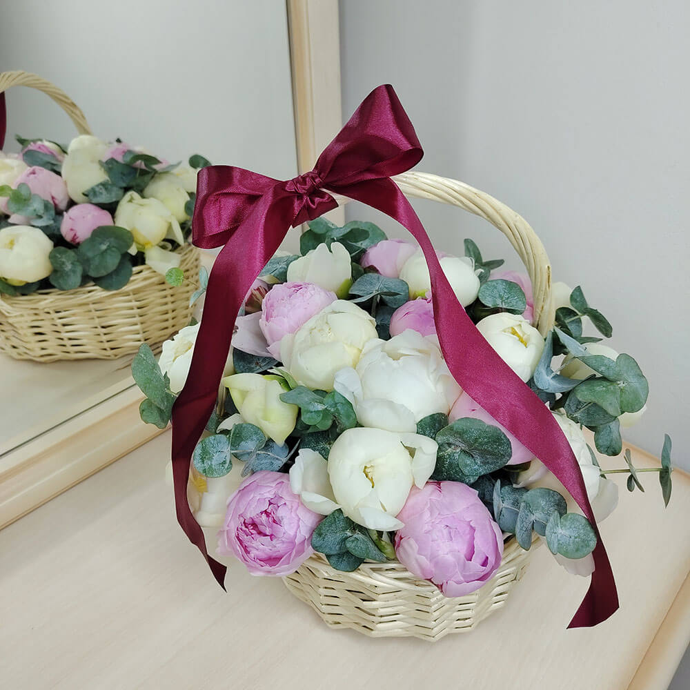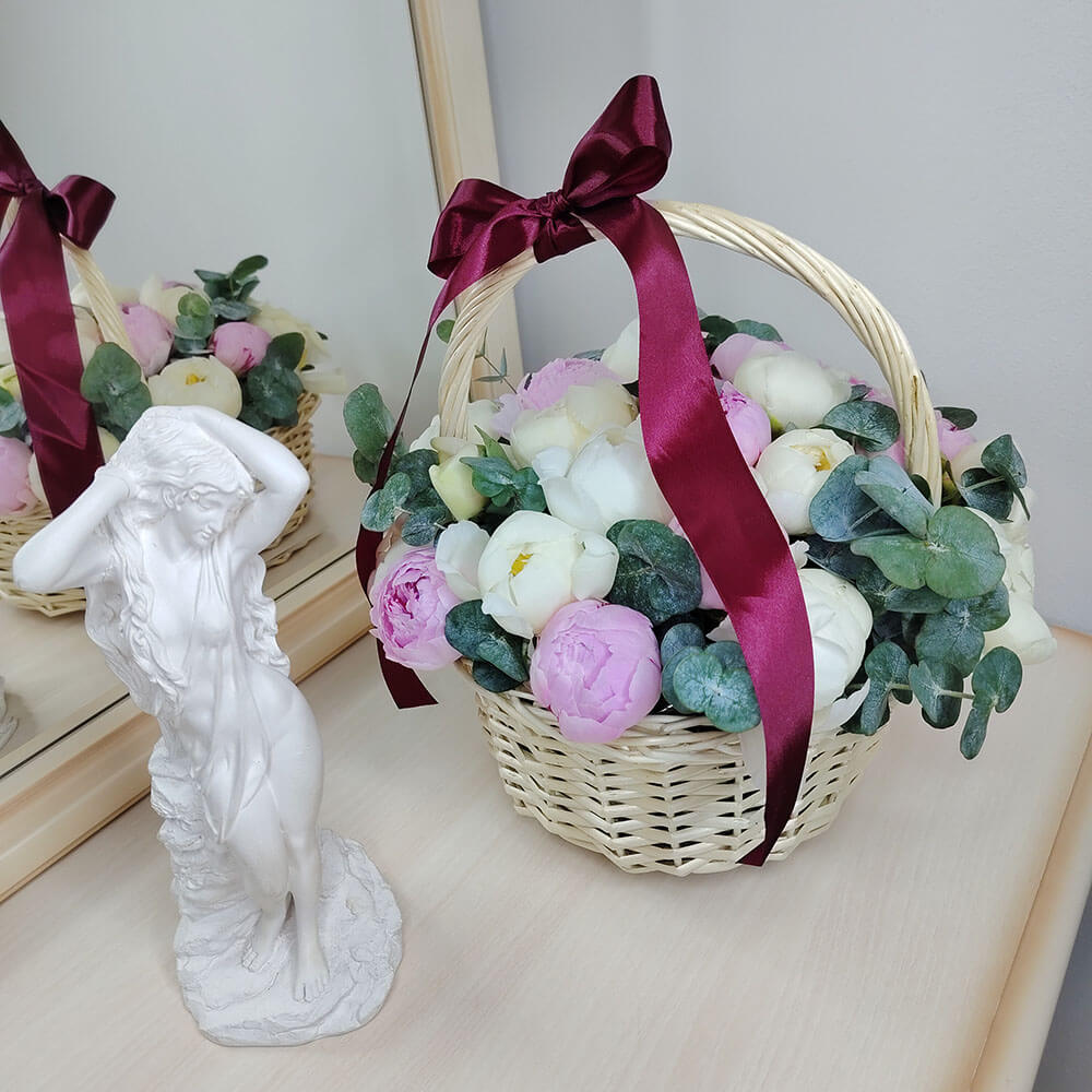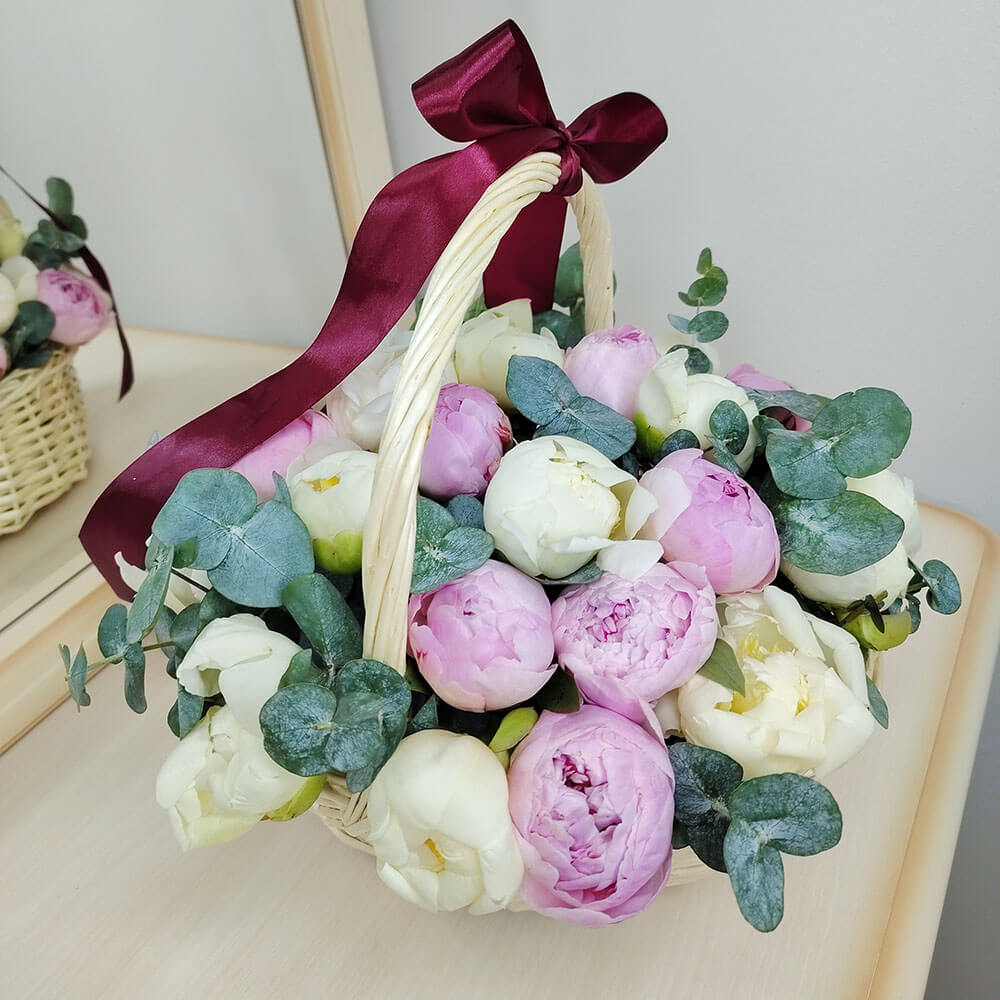Белые и розовые пышные пионы - символ нежности, красоты и искренности. Такой букет будет радовать не только своей красотой, но и нежным ароматом.