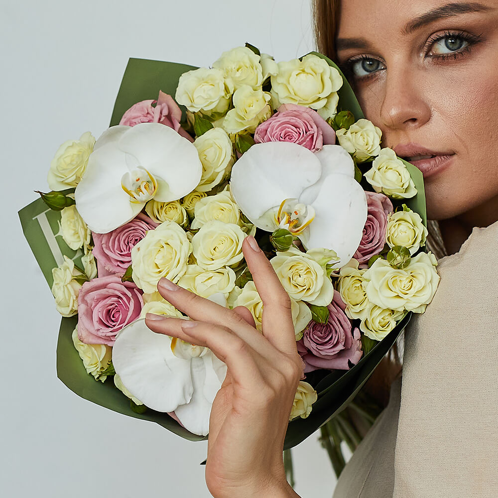 • 8 кустовых роз, 7 роз, орхидеи