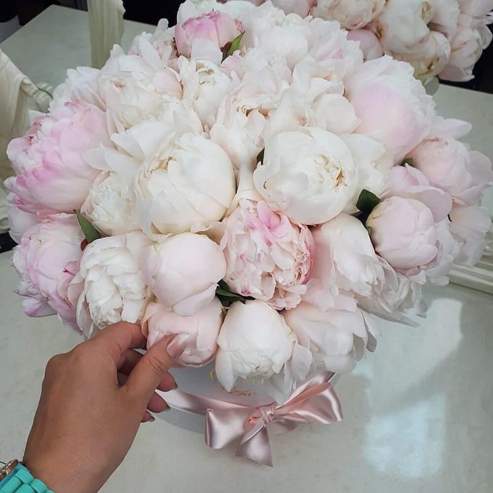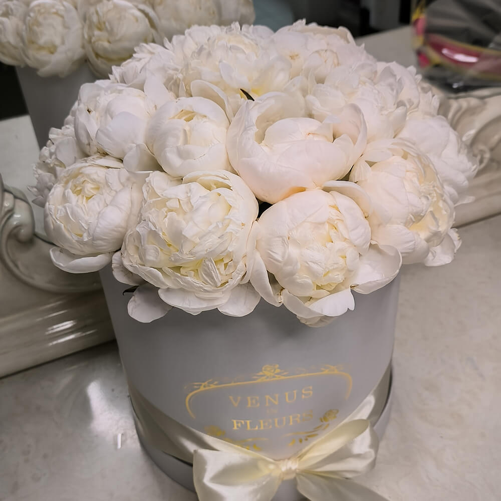 • белая коробка ручной работы, атласные ленты, флористическая губка