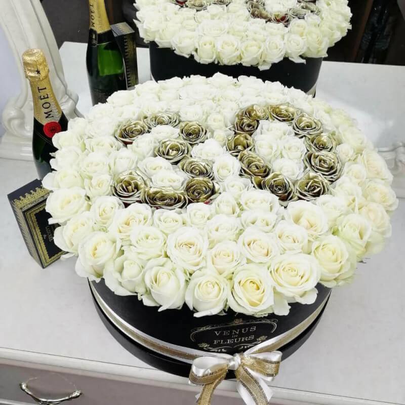 Необычное оформление букета, основанное на контрасте белого и золотого! Стильно, модно, благородно! Вы можете выбрать любую букву. Дизайн букета удивит даже самых привередливых.