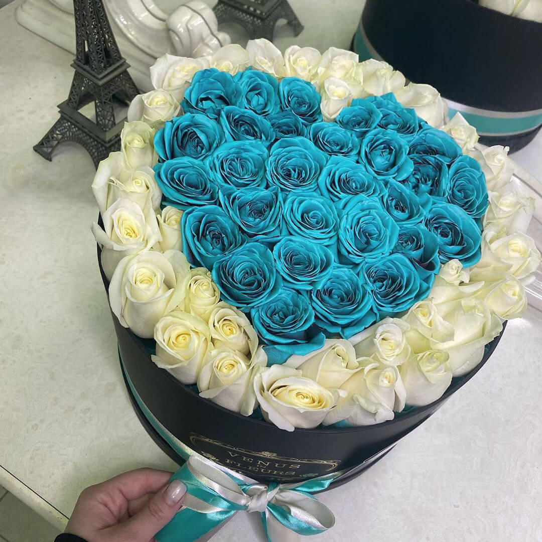 Это необычное сочетание бирюзовых роз с белыми является эксклюзивным в истории флористики. Невероятные расцветки, которых она ещё никогда не видела, абсолютно точно произведут впечатление. Ваша вторая половинка будет в восторге, увидев такое чудо в живую. Цветы мы закупаем каждое утро, чтобы они оставались максимально свежими; именно поэтому они Вас будут радовать от 7 до 14 дней.