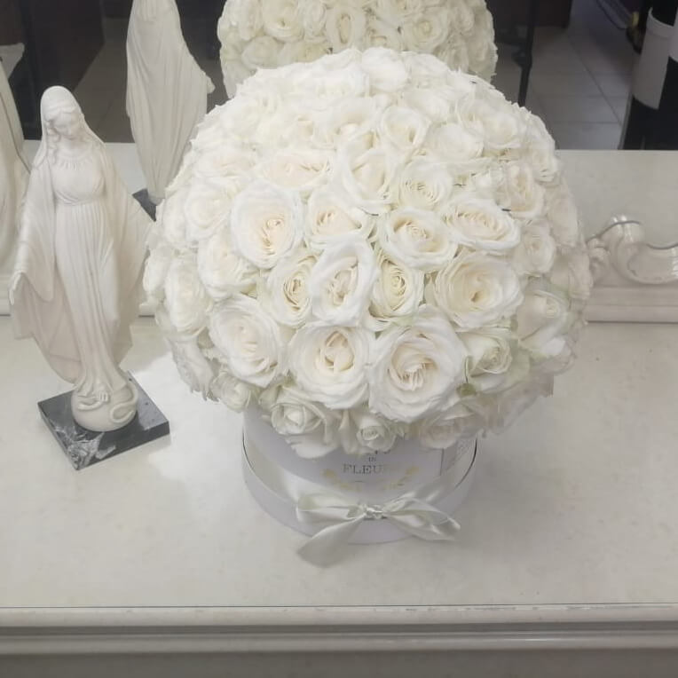 • белая коробка ручной работы, атласные ленты, флористическая губка