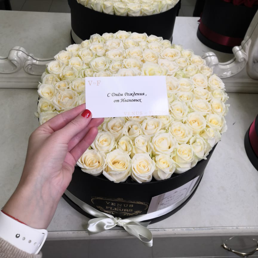 Белые розы – олицетворение чистоты и искренности чувств. Их изысканная красота и нежность делают их идеальным выбором для тех, кто стремится выразить самые возвышенные эмоции, будь то любовь, уважение или восхищение. Контраст белых роз с чёрной шляпной коробкой создаёт эффектный визуальный акцент, подчёркивающий элегантность и стиль композиции.