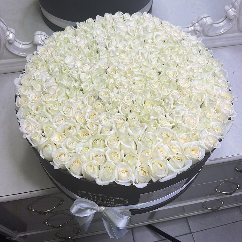 Шляпные коробки, в которых оформлены белые розы, обладают рядом значительных достоинств: