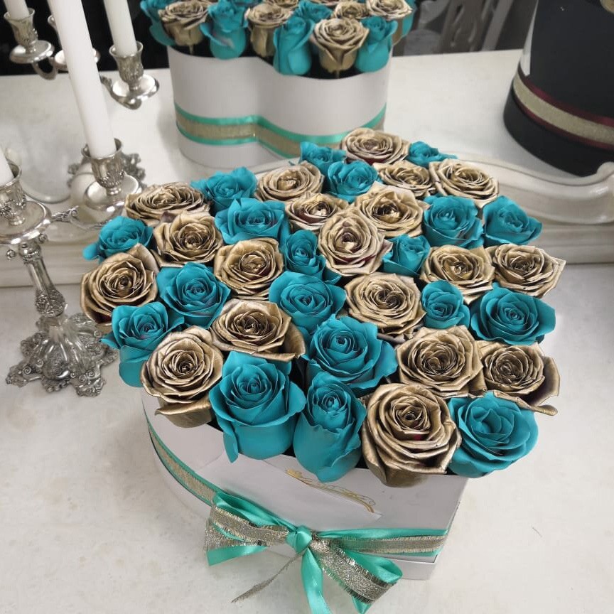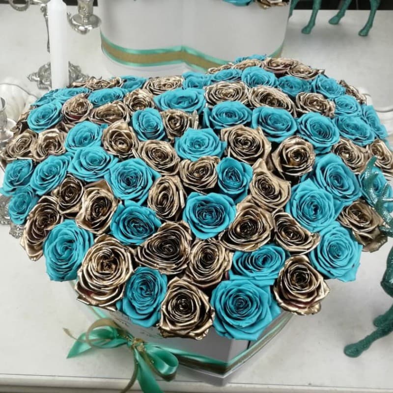 Это необычное сочетание бирюзовых роз с золотыми является эксклюзивным в истории флористики. Невероятные расцветки, которых она ещё никогда не видела, абсолютно точно произведут впечатление. Ваша вторая половинка будет в восторге, увидев такое чудо в живую. Цветы мы закупаем каждое утро, чтобы они оставались максимально свежими; именно поэтому они Вас будут радовать от 7 до 14 дней.