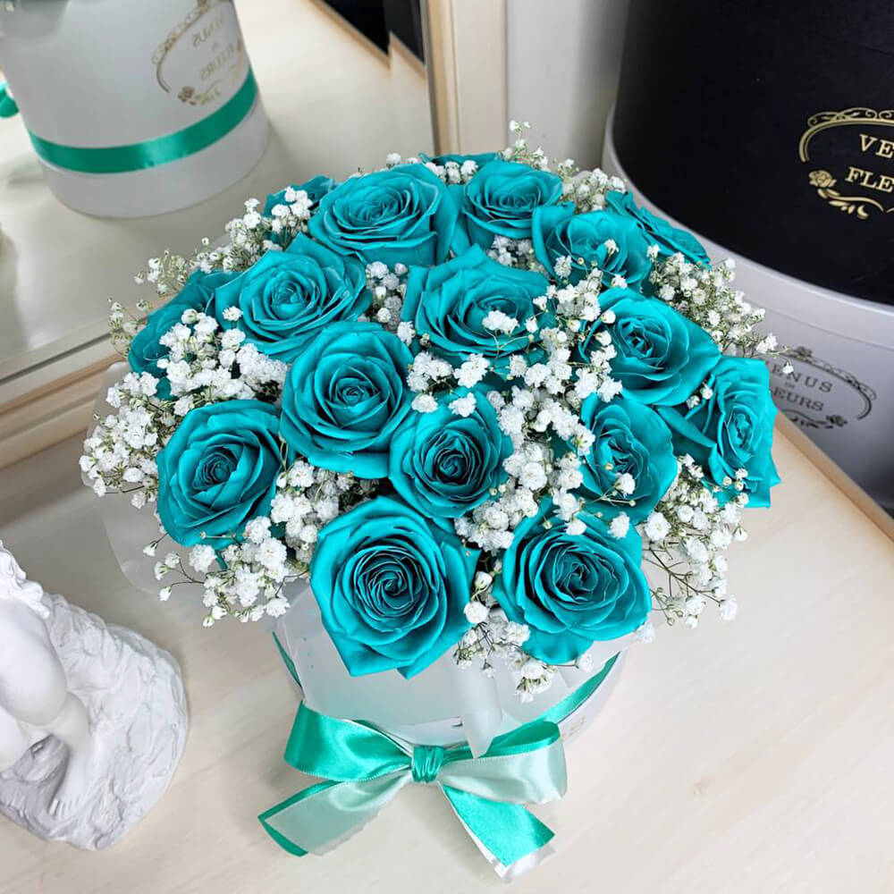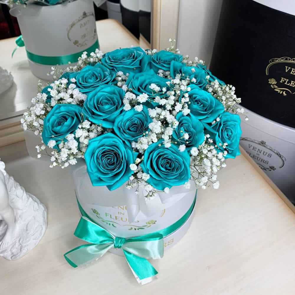 Это необычное сочетание бирюзовых роз с серебряными является эксклюзивным за всю историю флористики.