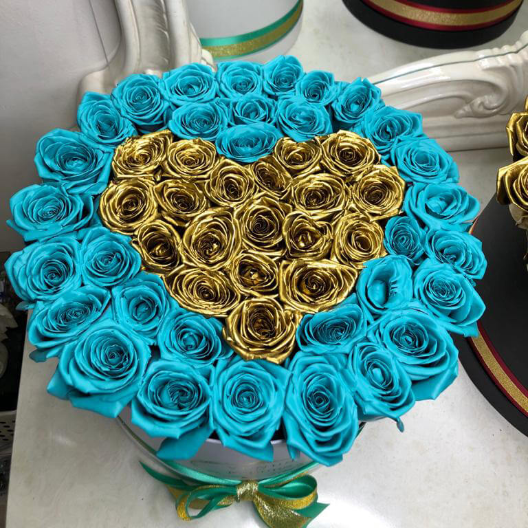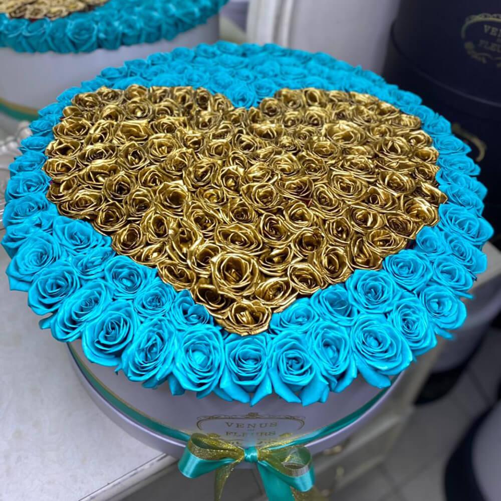 Невероятно красивая, богатая и стильная композиция из золотых и голубых роз в коробке! Такой букет точно сохранится в памяти на долгие годы, а также передаст ваши самые искренние чувства.