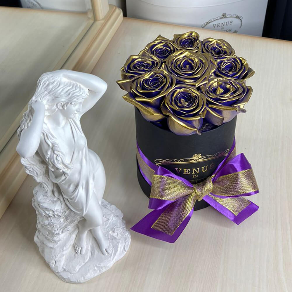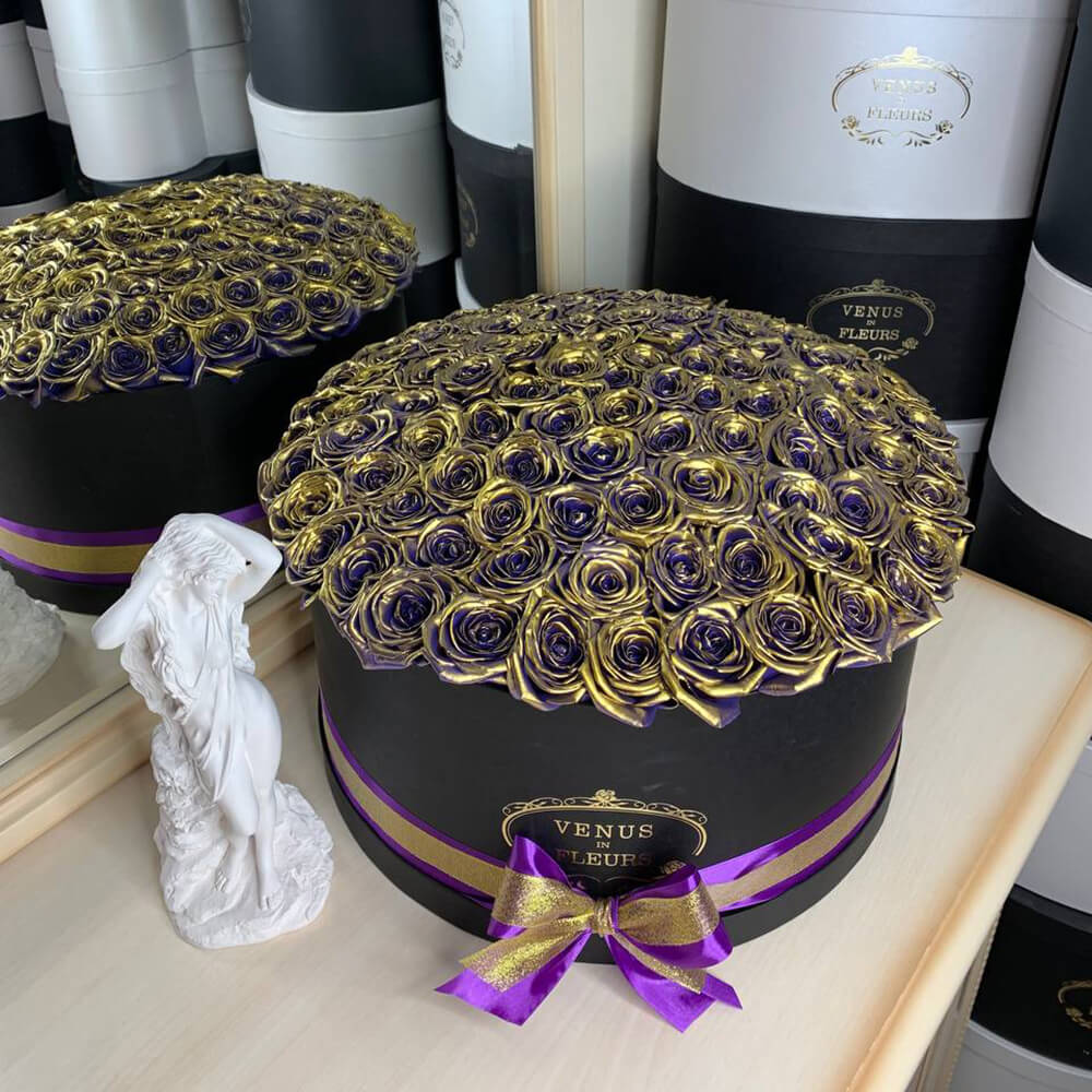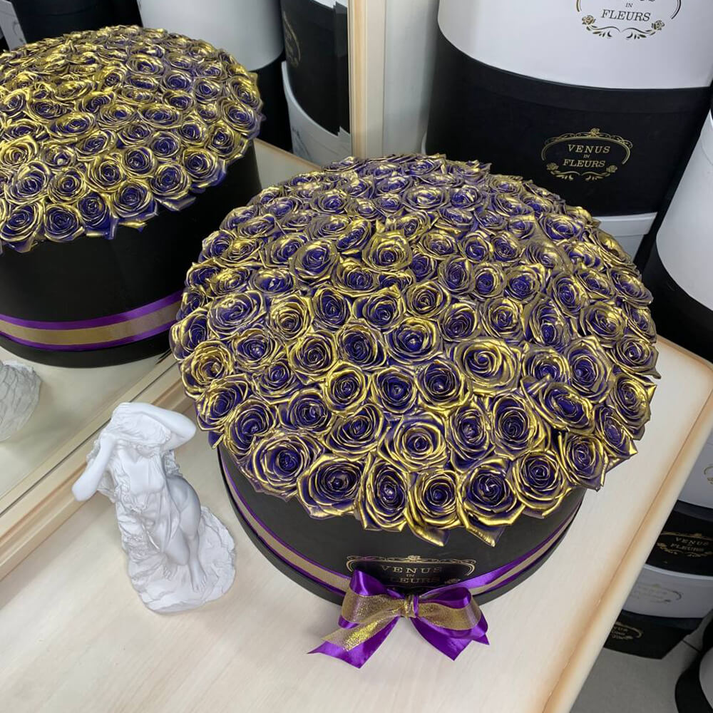 Роз такого цвета в природе не существует. Для их производства мы используем живые цветы и только высококачественную флористическую краску без запаха из Германии. Она гипоаллергенна, не пачкается и не осыпается. Ароматизируем розы легким цветочным парфюмом.