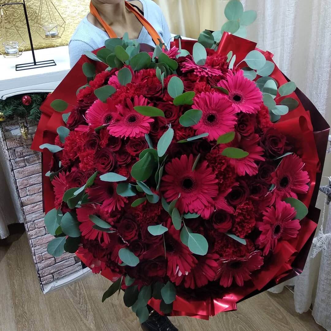 • 10 гербер, 20 гвоздик, 21 роза, эвкалипт