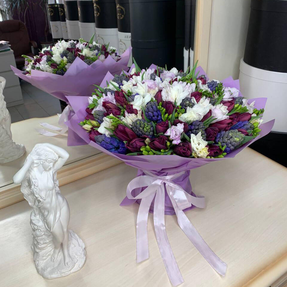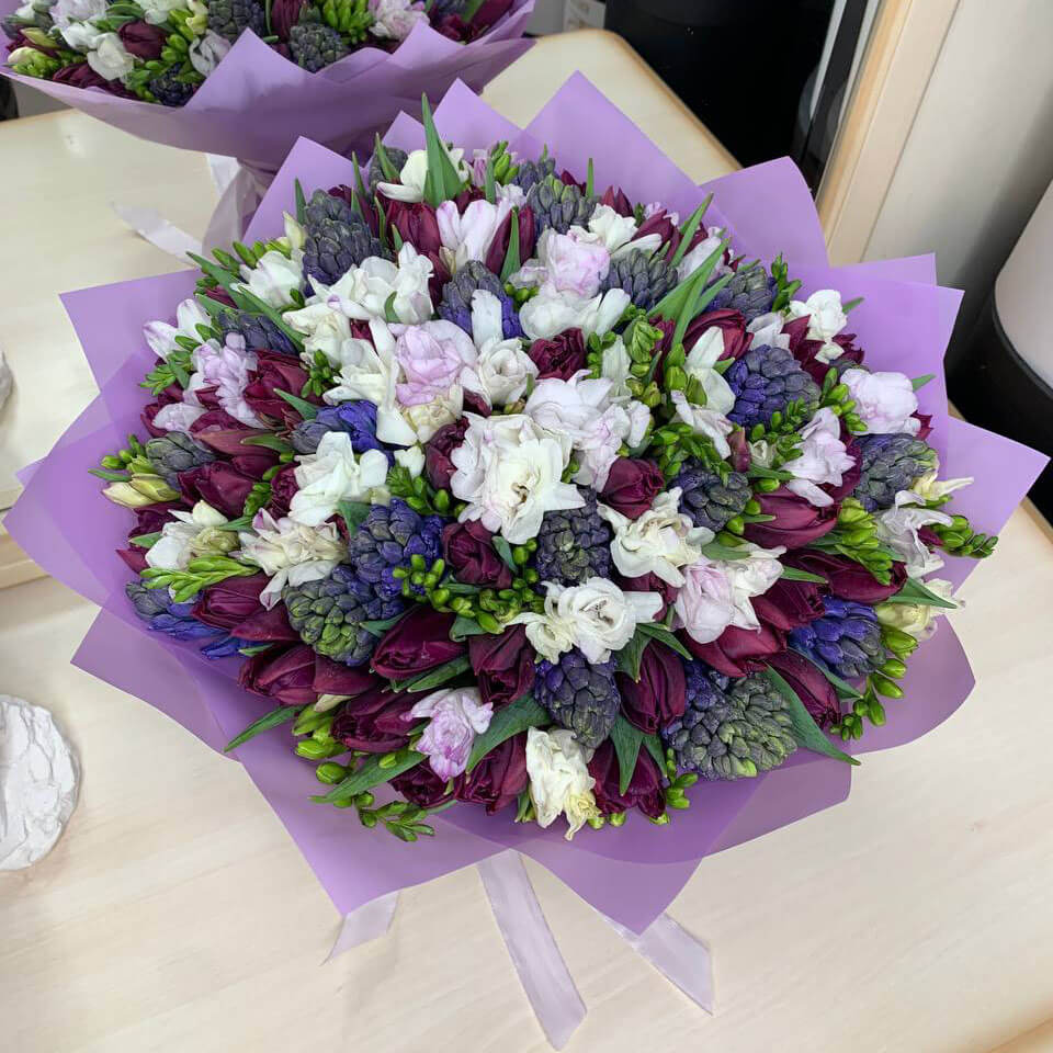 Букет из гиацинт с тюльпанами и фрезией - 125 шт.