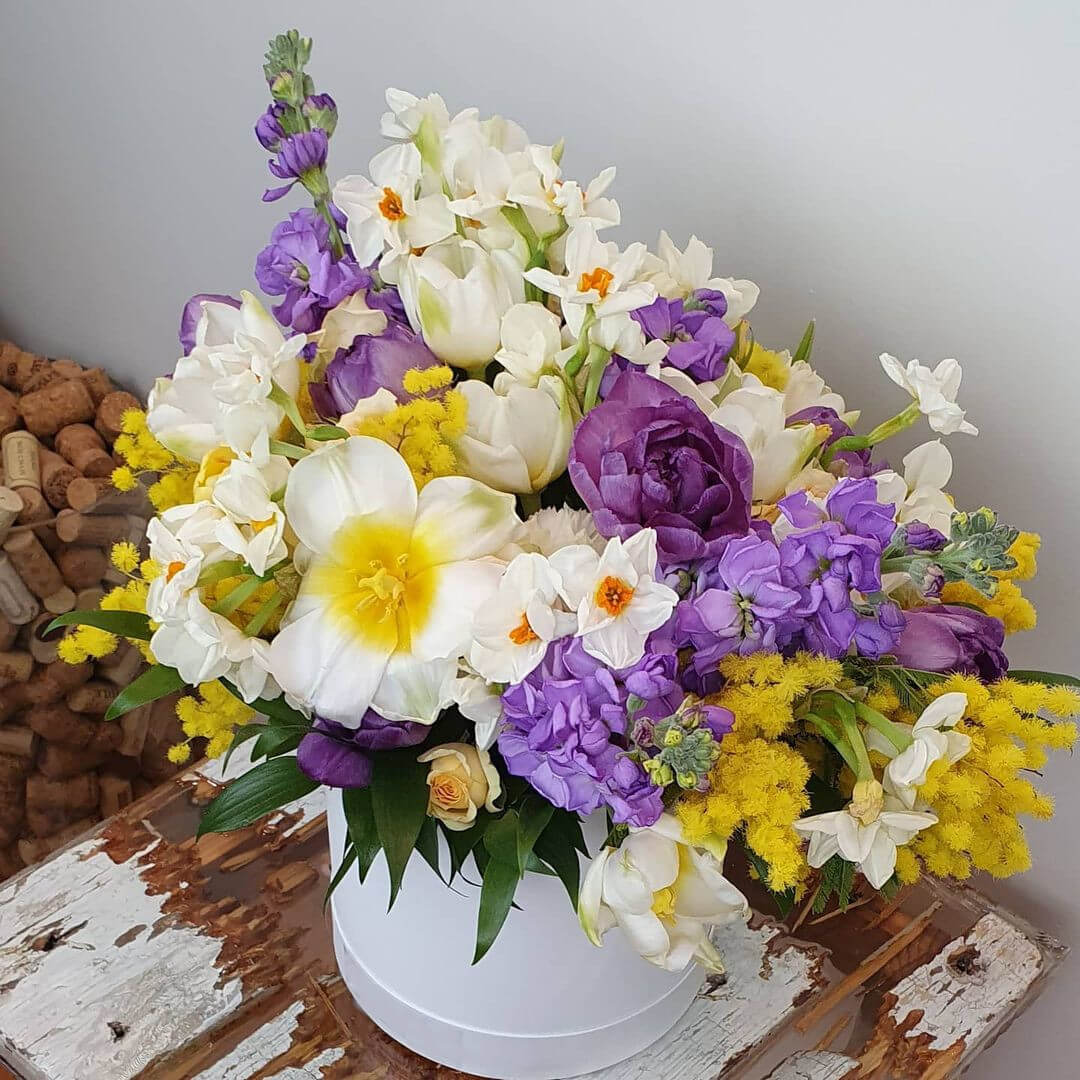 • 10 нарцисссов, 5 маттиол, 6 мимоз, 10 тюльпанов, зелень