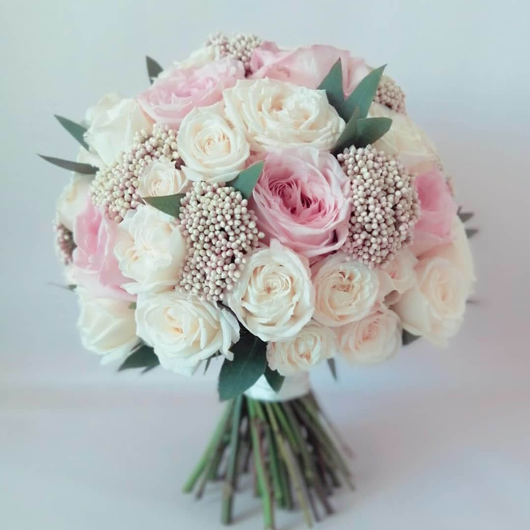• 10 кустовых роз, 9 роз, эвкалипт, озотамнус