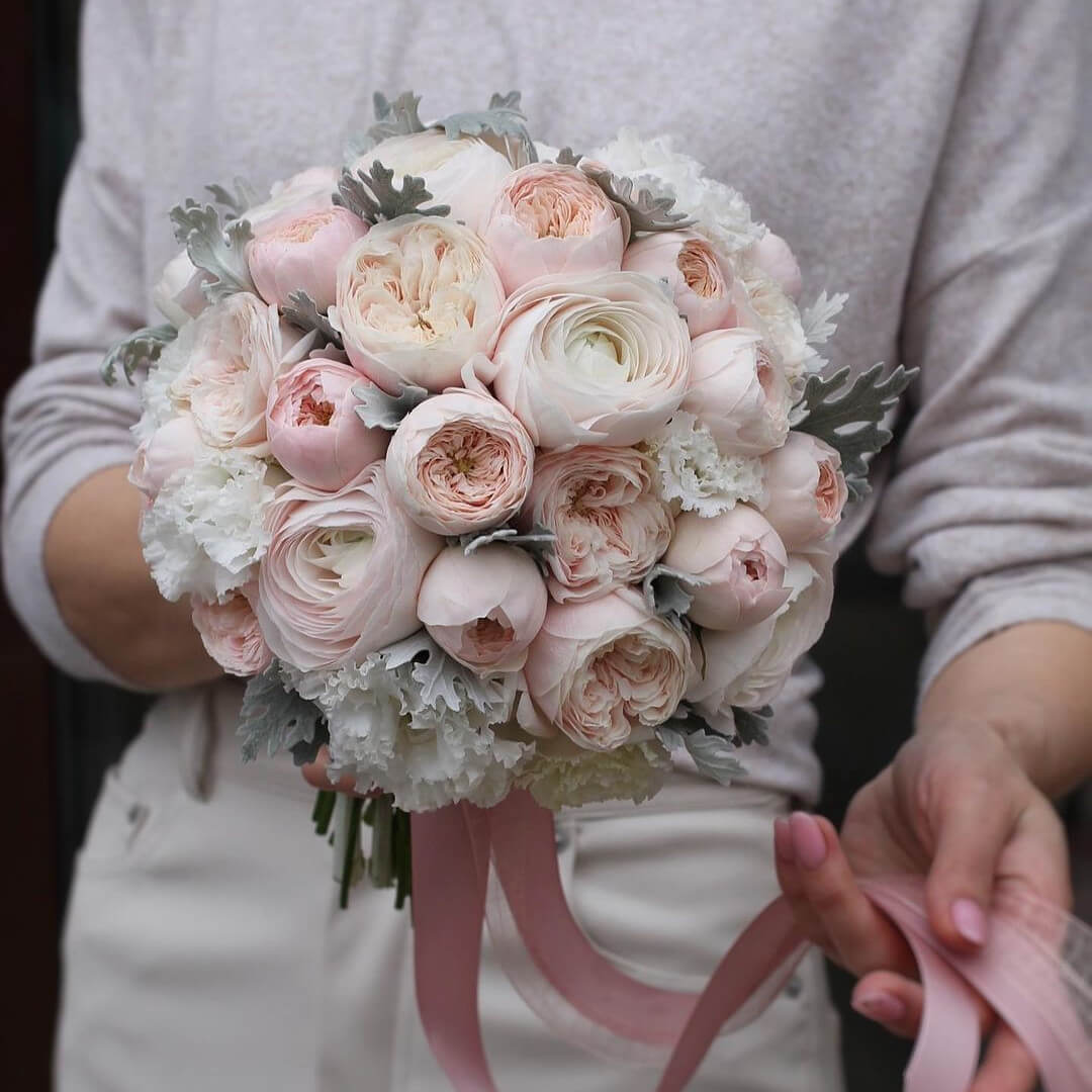 • 10 пионовидных роз, 10 ранункулюсов, 9 гвоздик, зелень