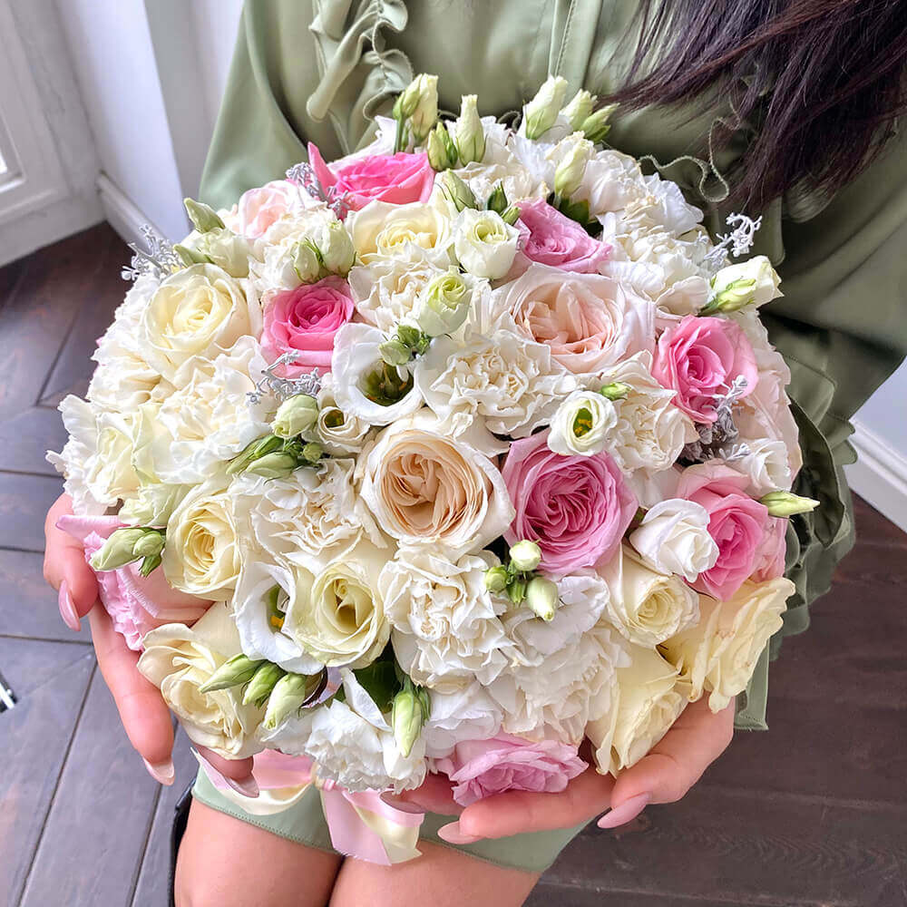 • 20 гвоздик, 21 роза, 10 эустом, зелень