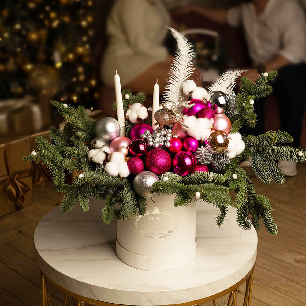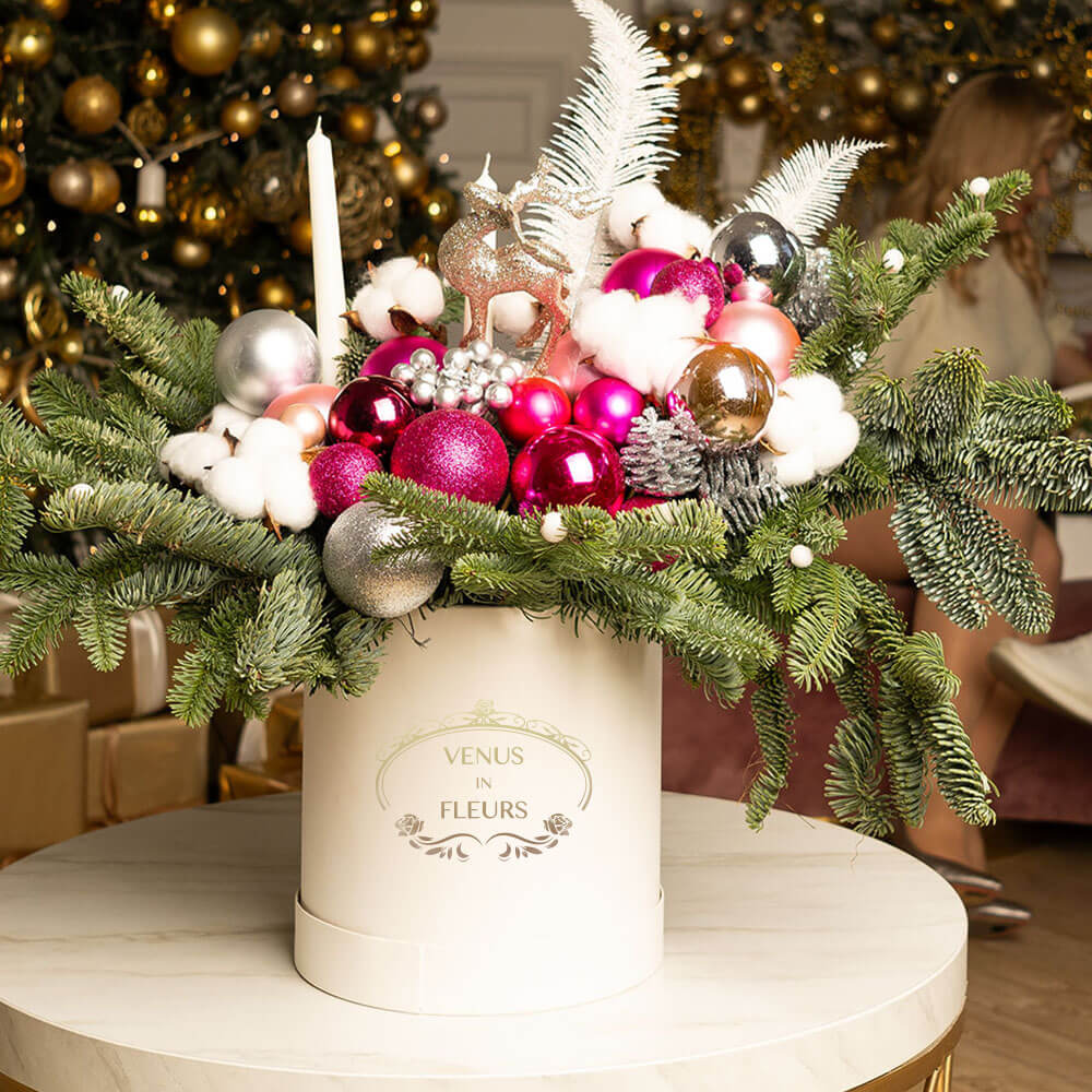 2. Новогодний букет будет радовать вас на протяжении всех новогодних праздников, цветы в коробке при поливе хранятся от 7 до 14 дней.