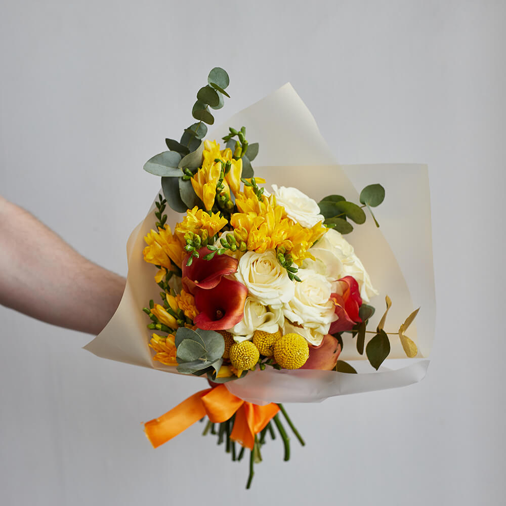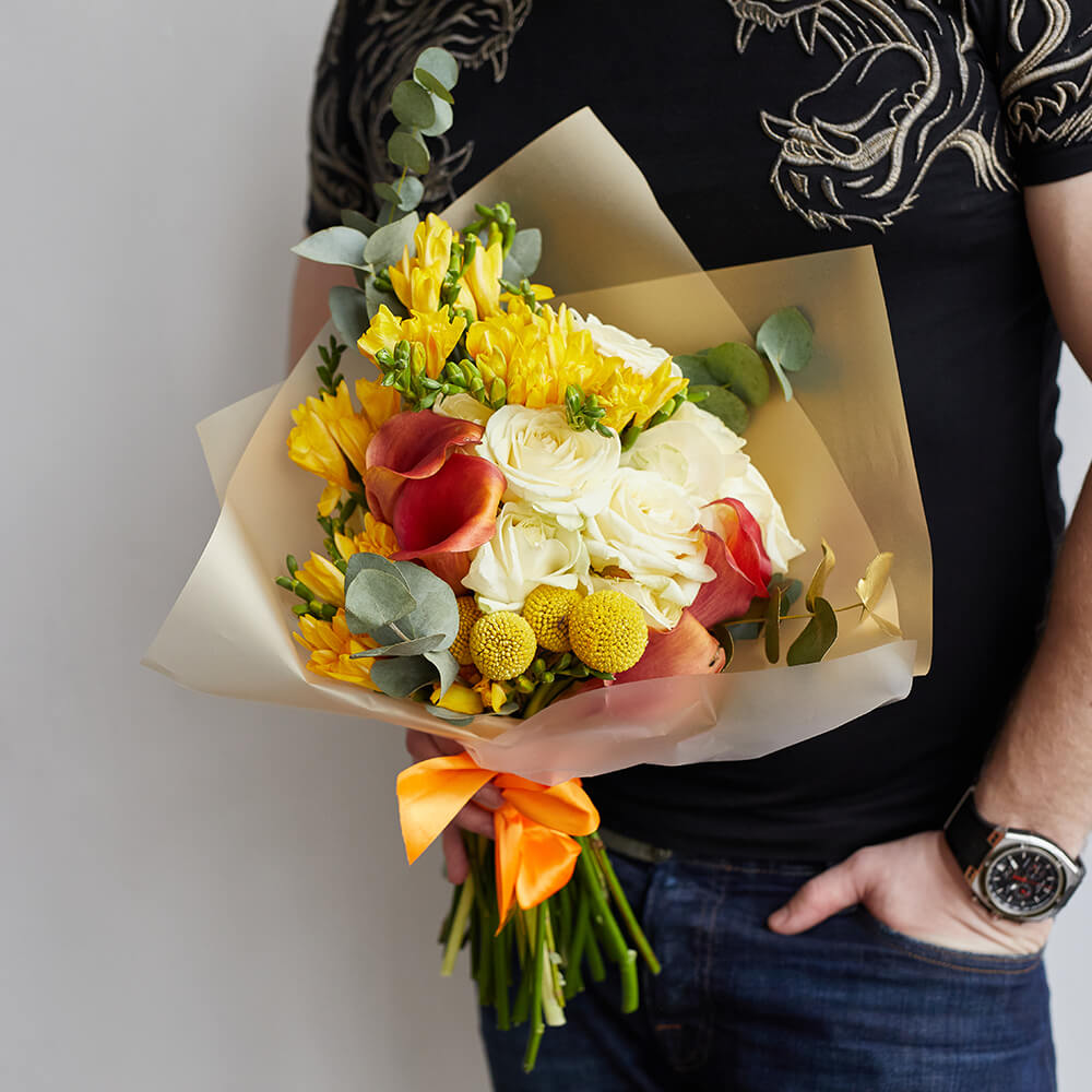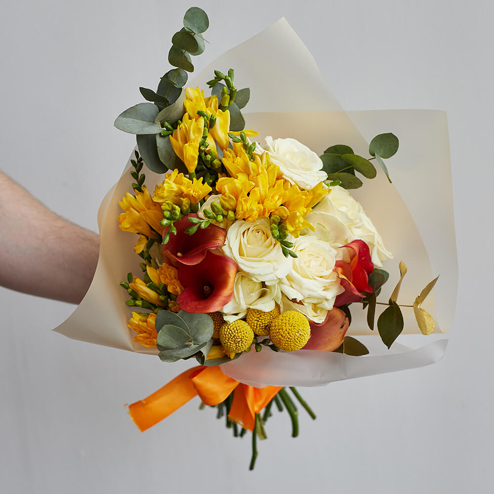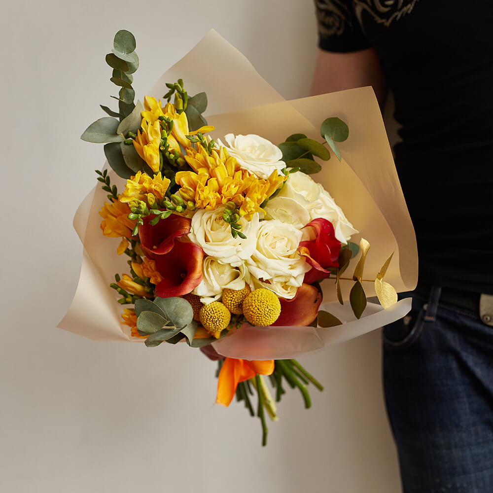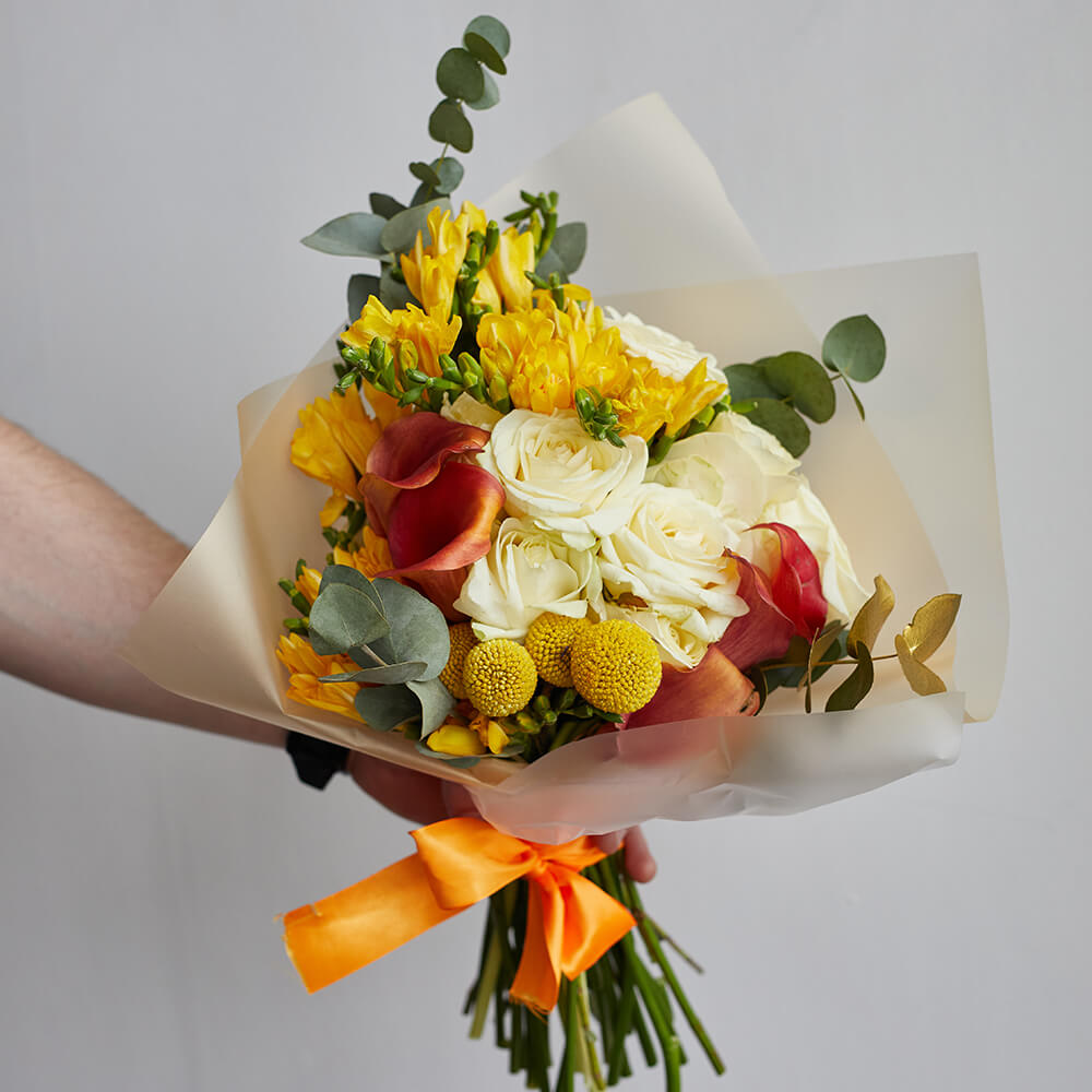 • 20 фрезий, 6 роз, 5 калл, 4 краспедий, эвкалипт