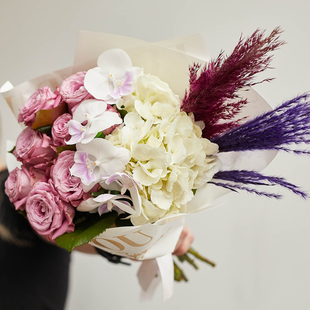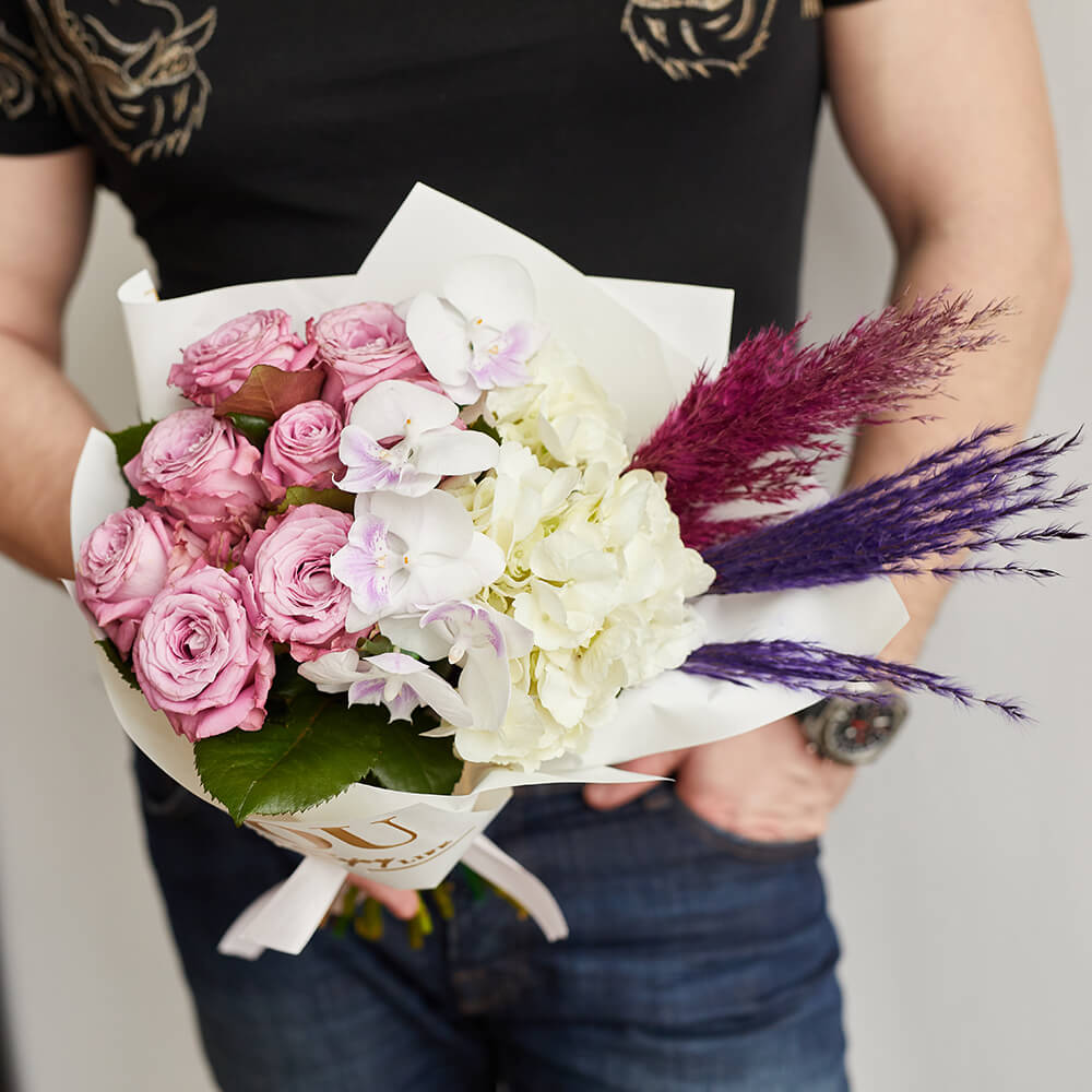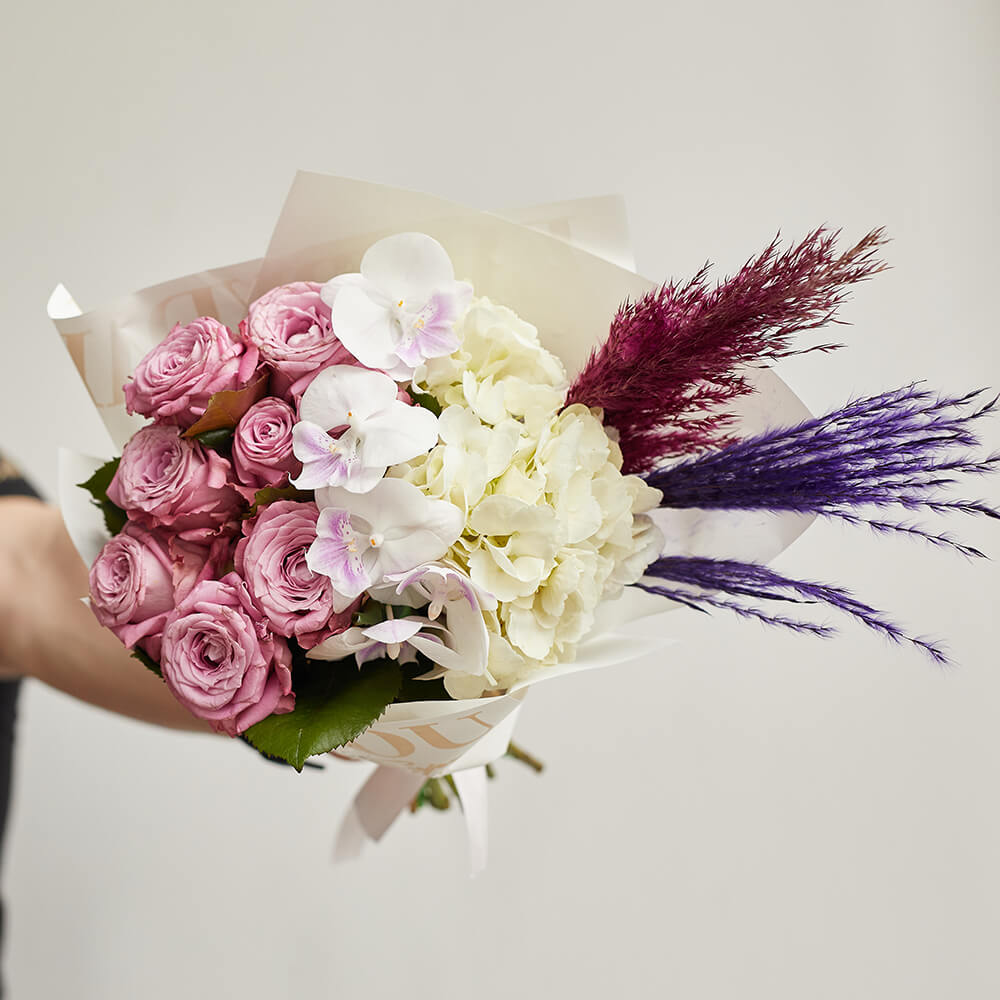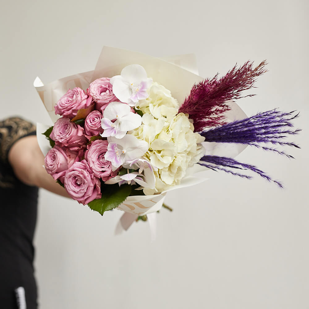 • 9 роз, 5 орхидей фаленопсис, 1 гортензия, сухоцветы, салал