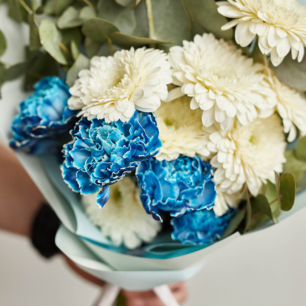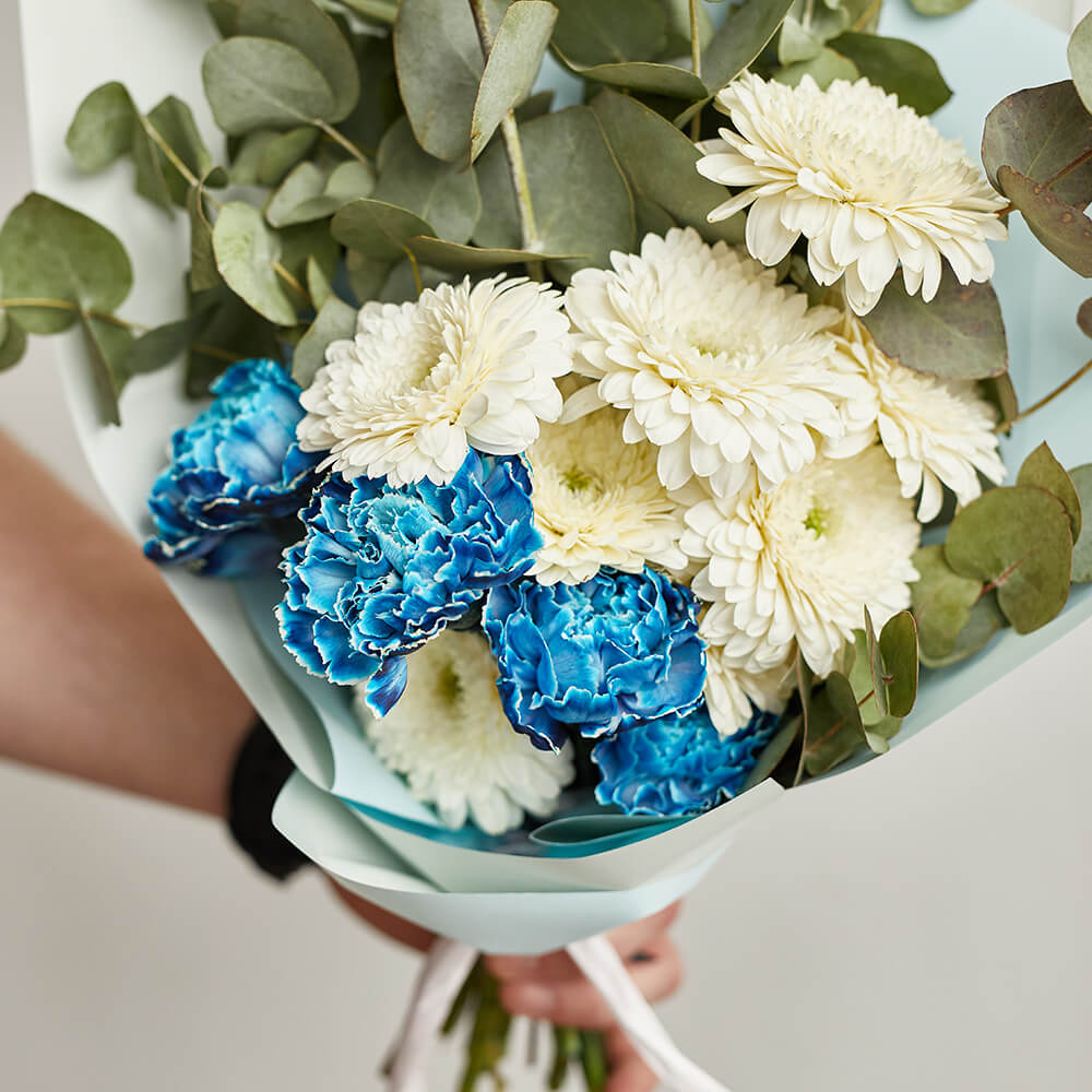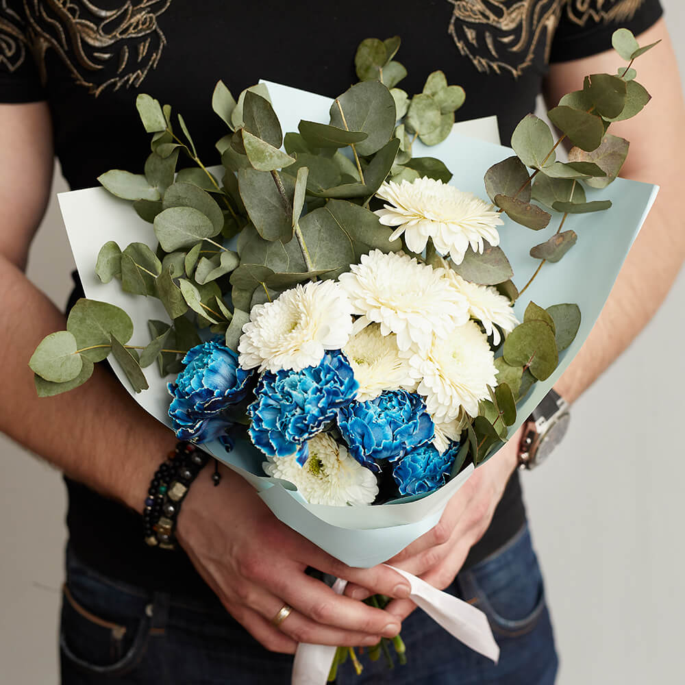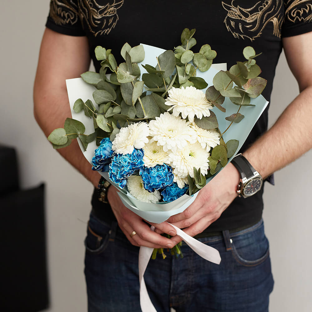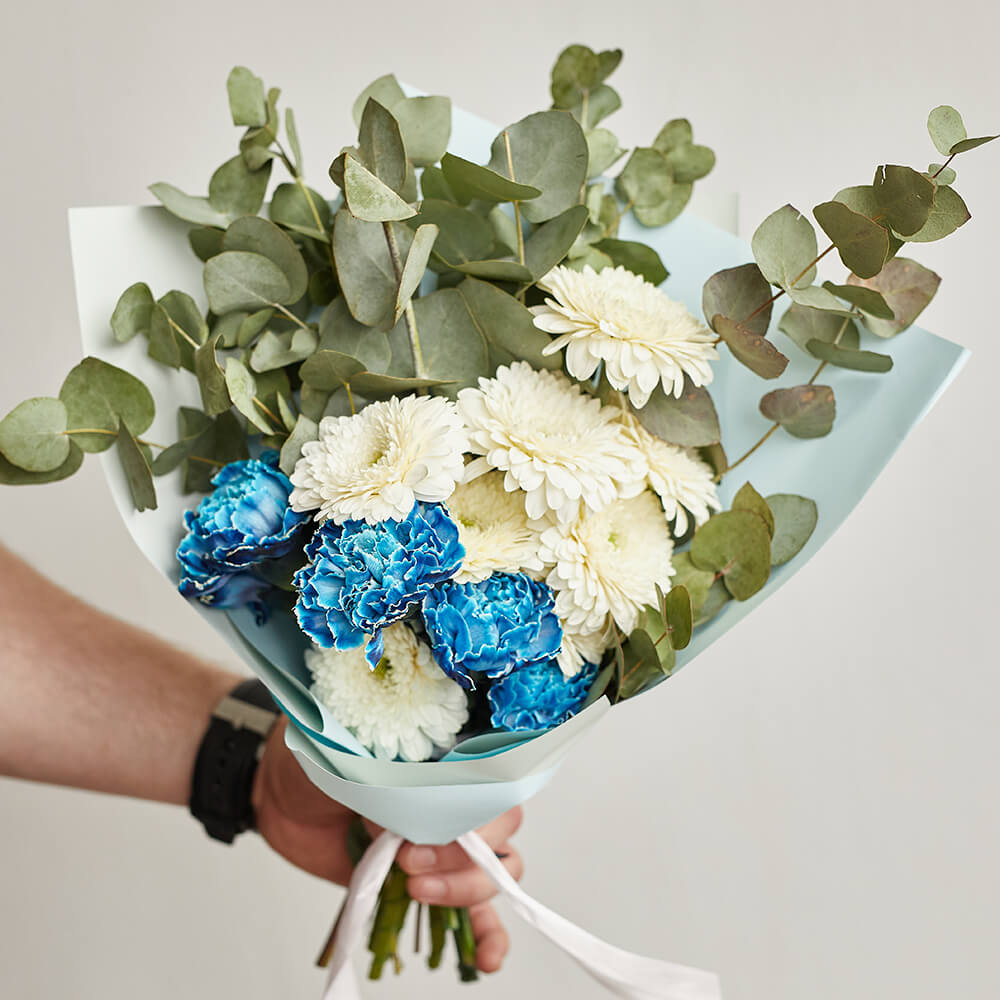 • 8 гербер, 5 гвоздик, эвкалипт