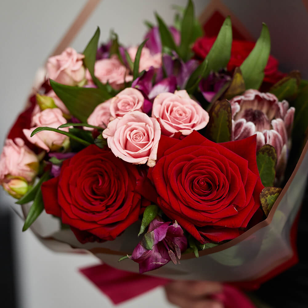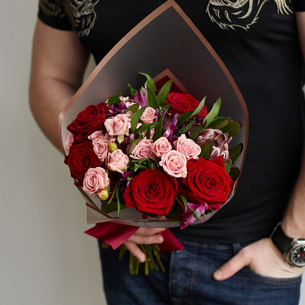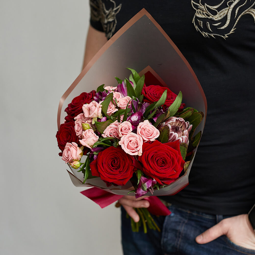 • 5 роз, 6 кустовых роз, 5 альстромерий, 1 протея