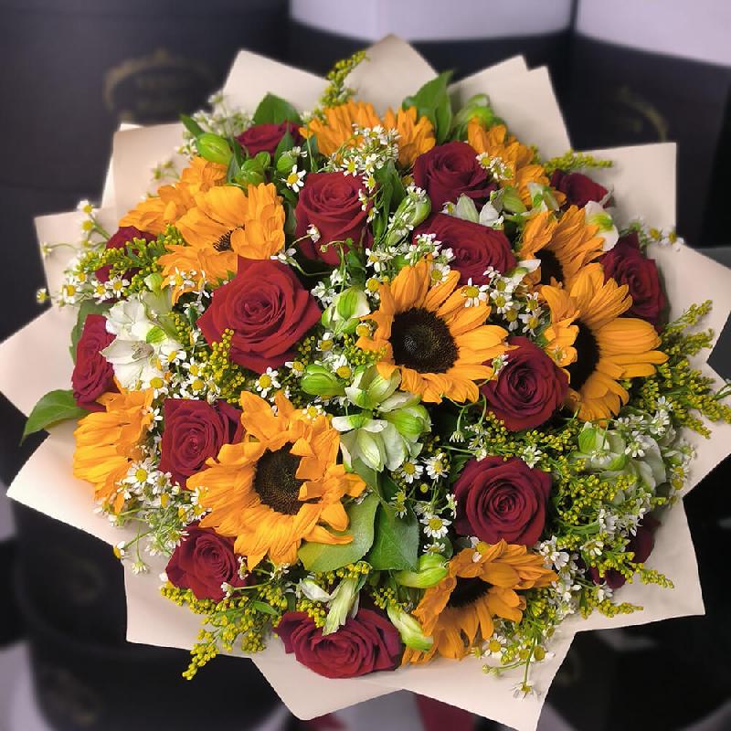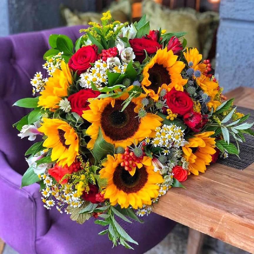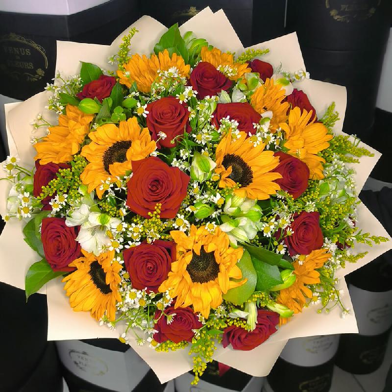 • 10 подсолнухов, 11 роз, 15 кустовых ромашек, 5 мимоз, зелень