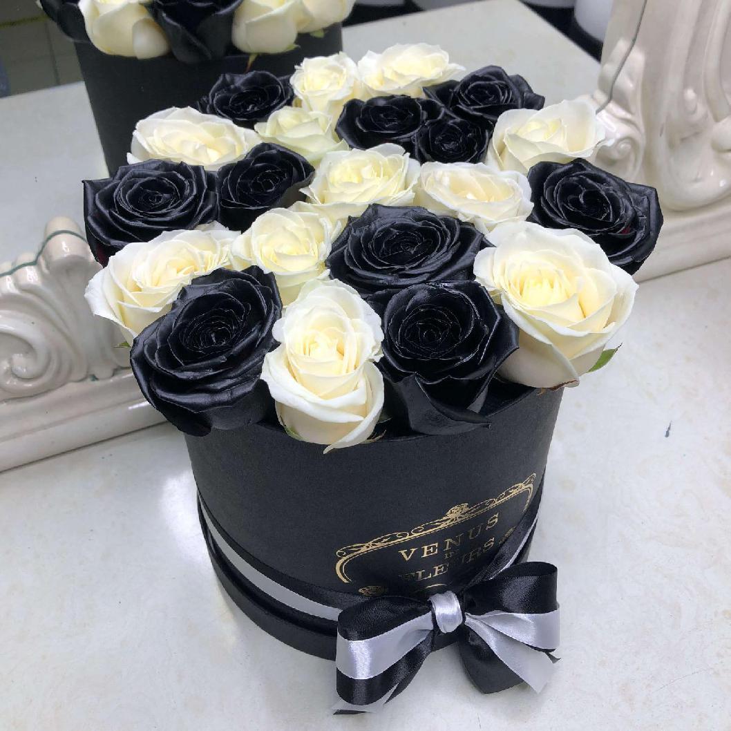 Роз черного цвета в природе не существует. Для их производства мы используем живые цветы и только высококачественную флористическую краску без запаха из Германии. Она гипоаллергенна, не пачкается и не осыпается. Ароматизируем розы легким цветочным парфюмом.