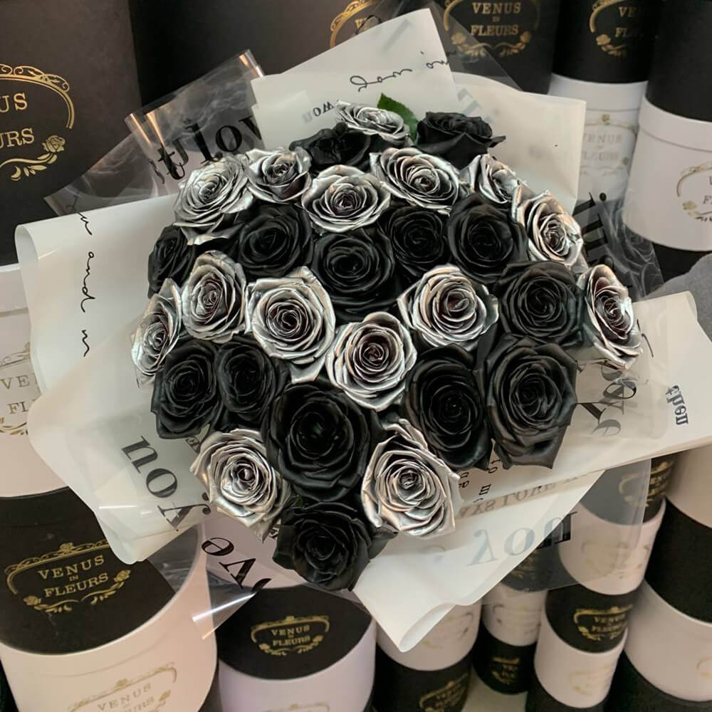 Букет из черных роз с серебряными - это стильно, элегантно и необычно. Такая композиция станет шикарным подарком как для женщины, так и для мужчины.