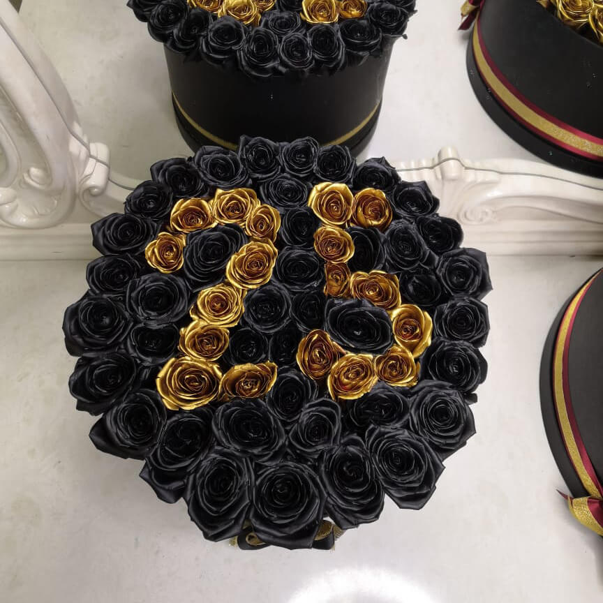 Композиция из черных и золотых роз с датой - это стильно, элегантно и необычно. Такая композиция станет шикарным подарком как для женщины, так и для мужчины.