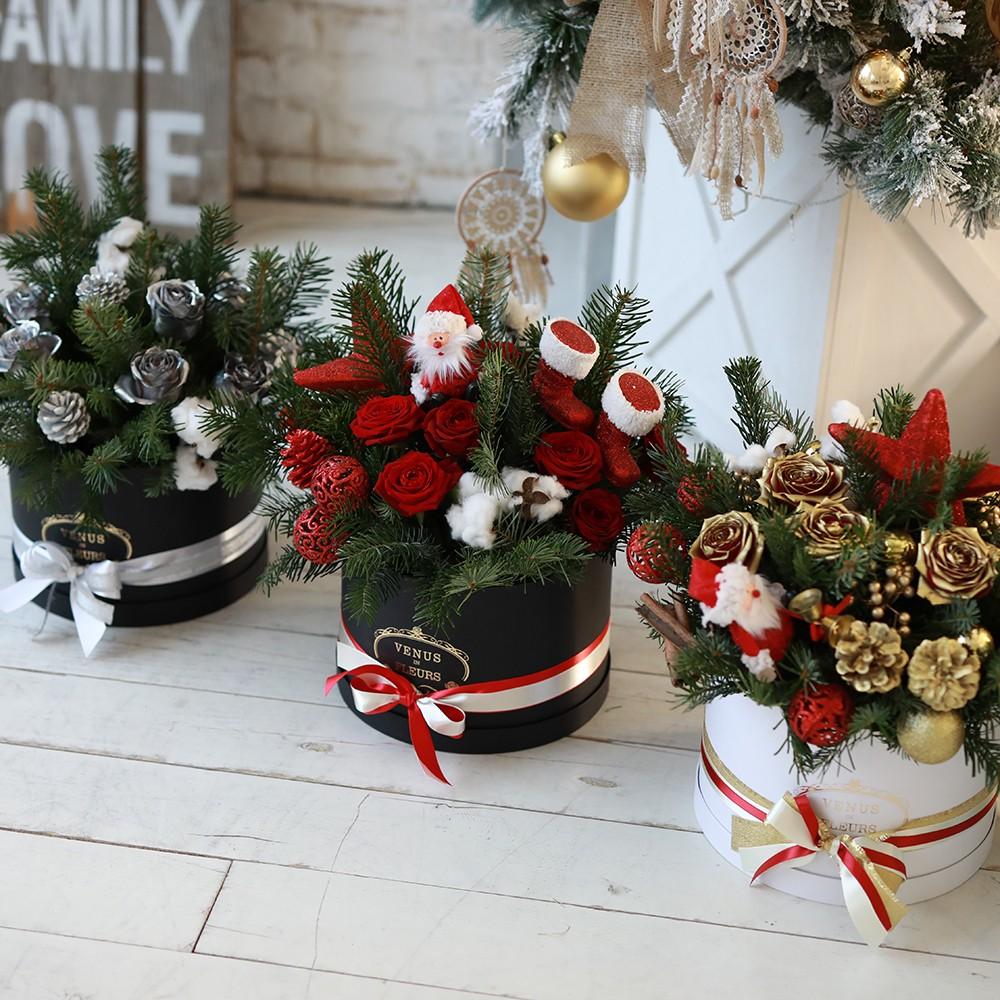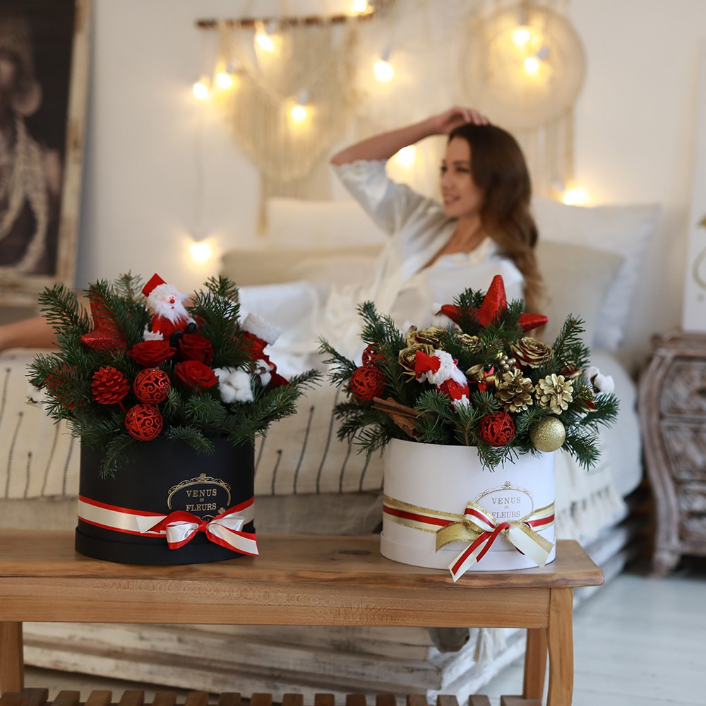 2. Новогодний букет будет радовать вас на протяжении всех новогодних праздников, цветы в коробке при поливе хранятся от 7 до 14 дней.