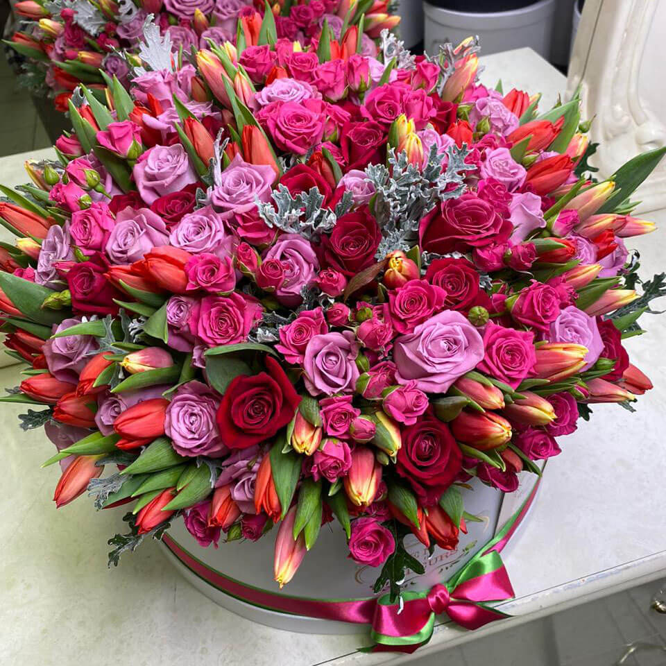 • 50 тюльпанов, 21 роза, 10 кустовых роз, зелень