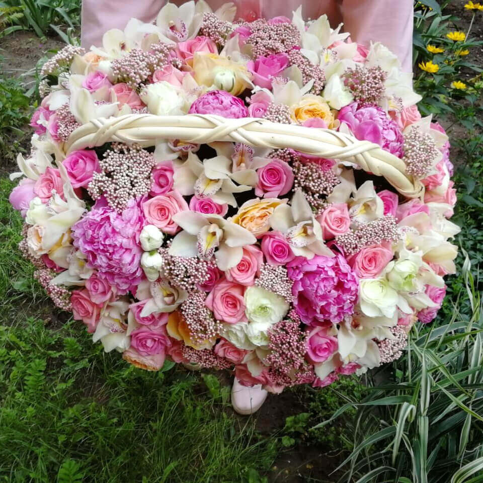Это очень нежная и душевная композиция - цветы в корзине. Такой подарок точно станет центром внимания на любом торжестве.