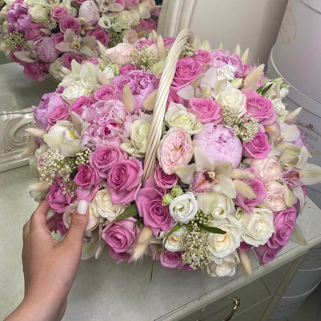 • 10 пионов, 65 роз, 6 орхидей, 10 пионовидных роз, 10 озотамнусов, лагурус