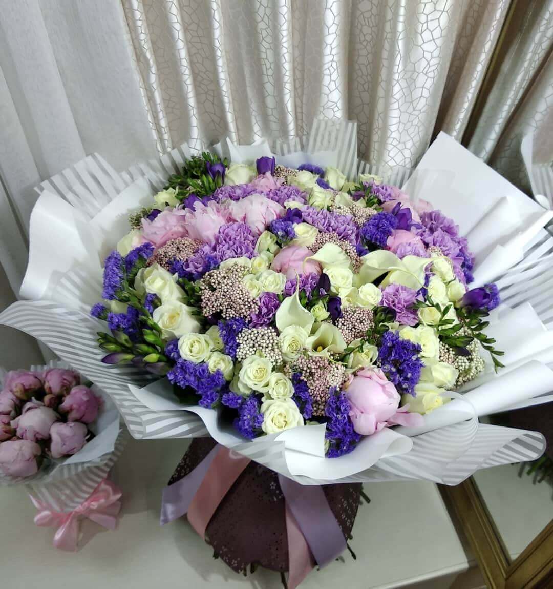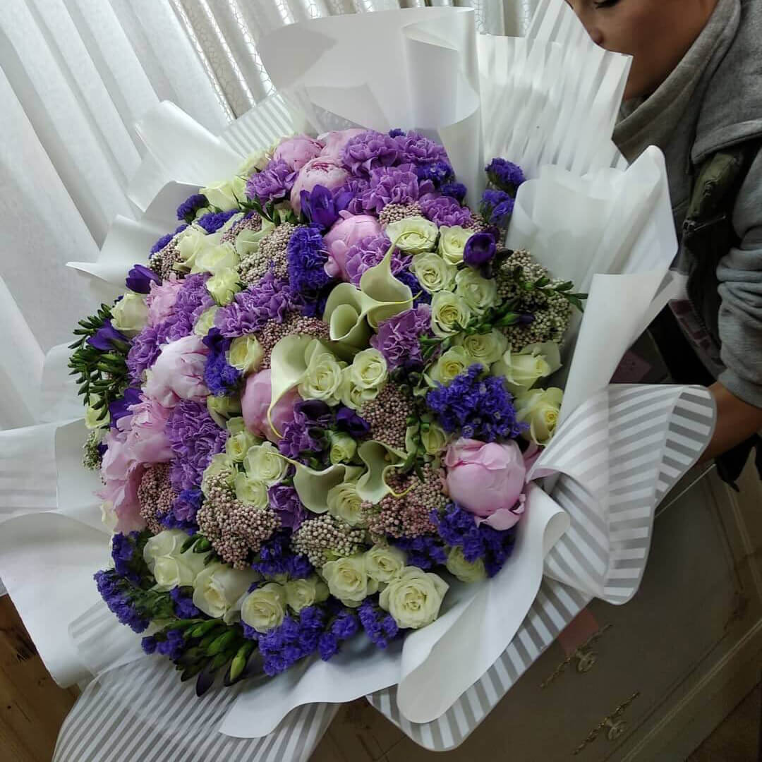 • 10 калл, 10 статиц, 20 гвоздик, 10 пионов, 11 роз, 10 кустовых роз, озотамнус,
